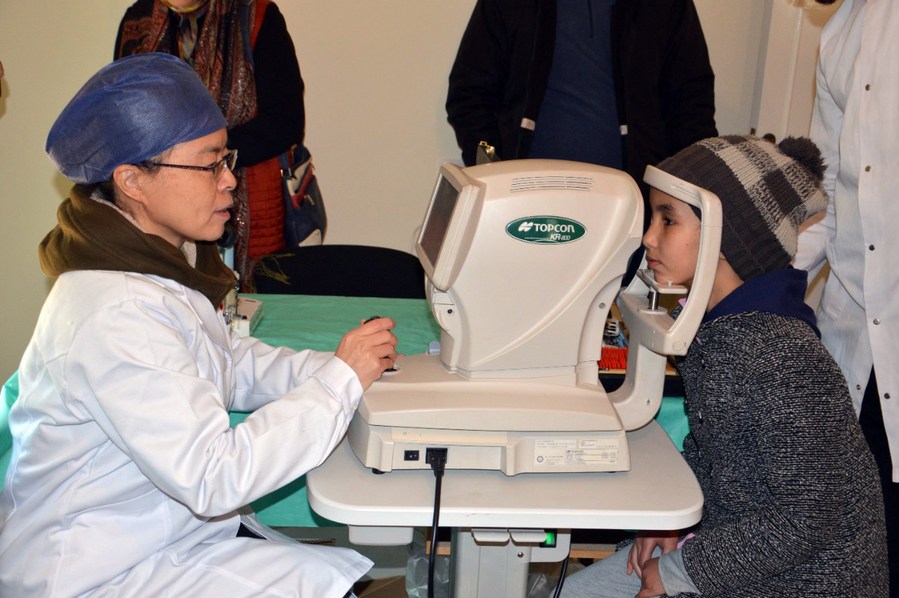 Ophthalmologist Jin Xi from the Chinese Medical Team checks the eyes of a child during a free medical treatment activity in Taza, Morocco, Jan. 12, 2023. (Chinese Medical Team in Morocco/Handout via Xinhua)