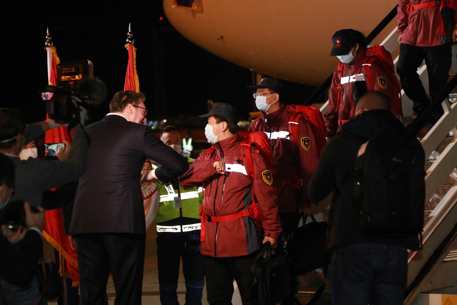 Serbian President Aleksandar Vucic (L) greets members of the Chinese medical team via elbow contact in Belgrade, Serbia, March 21, 2020. (Xinhua/Shi Zhongyu)