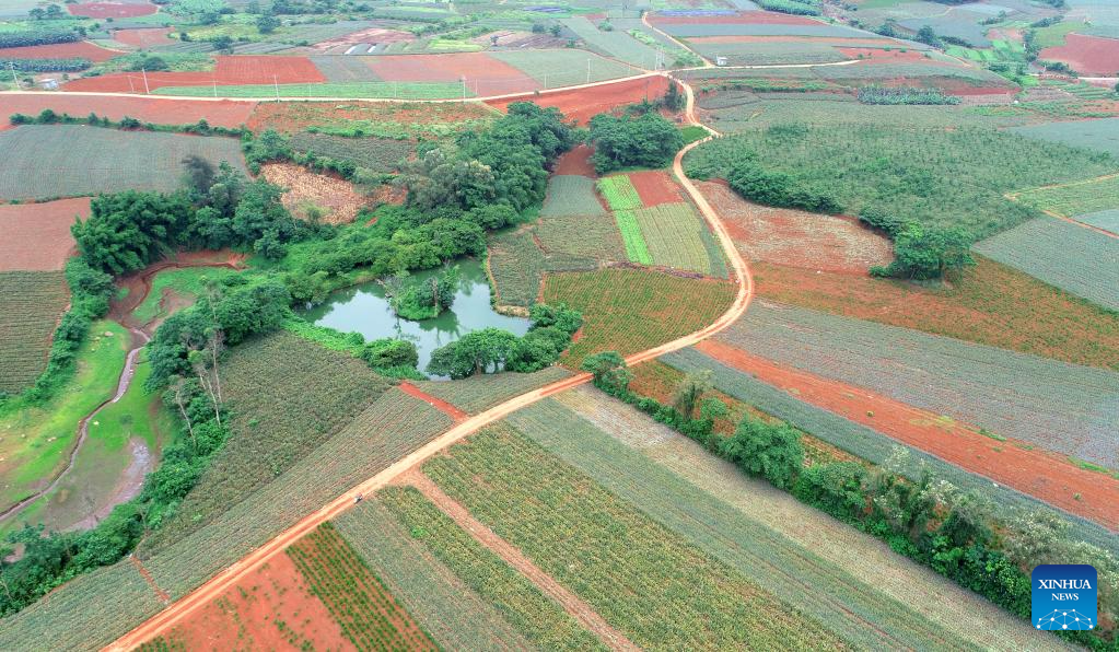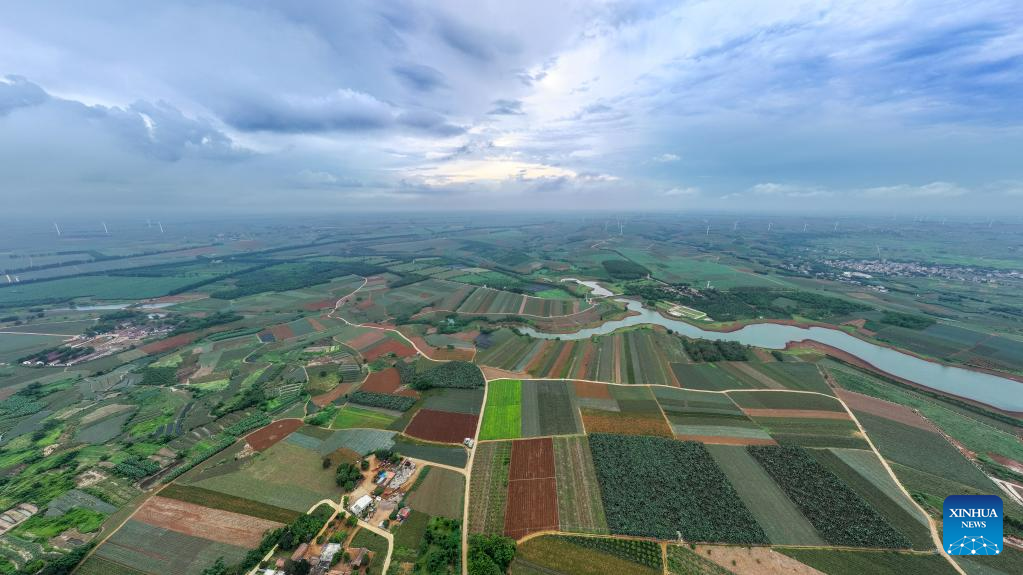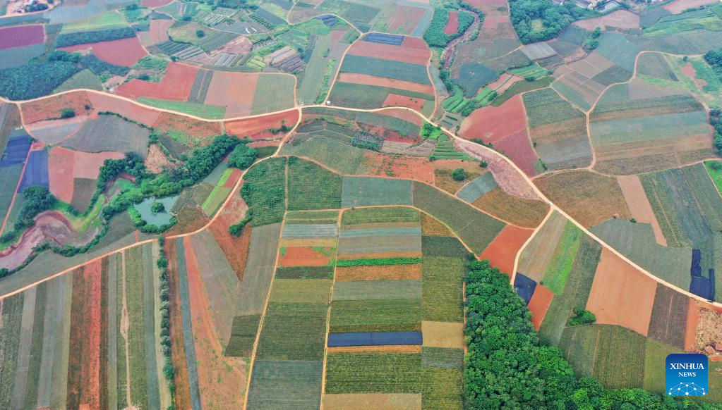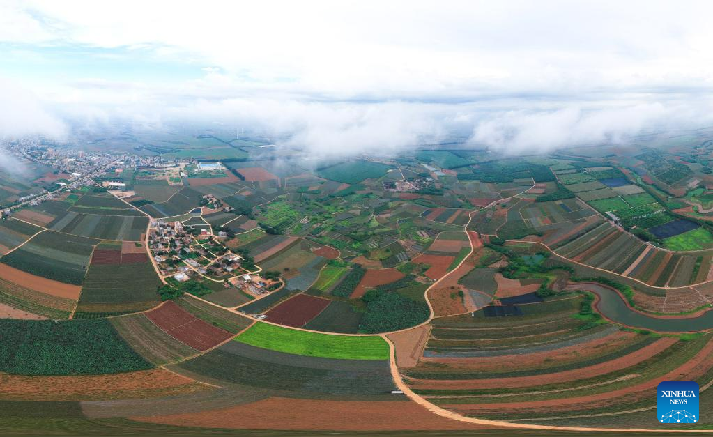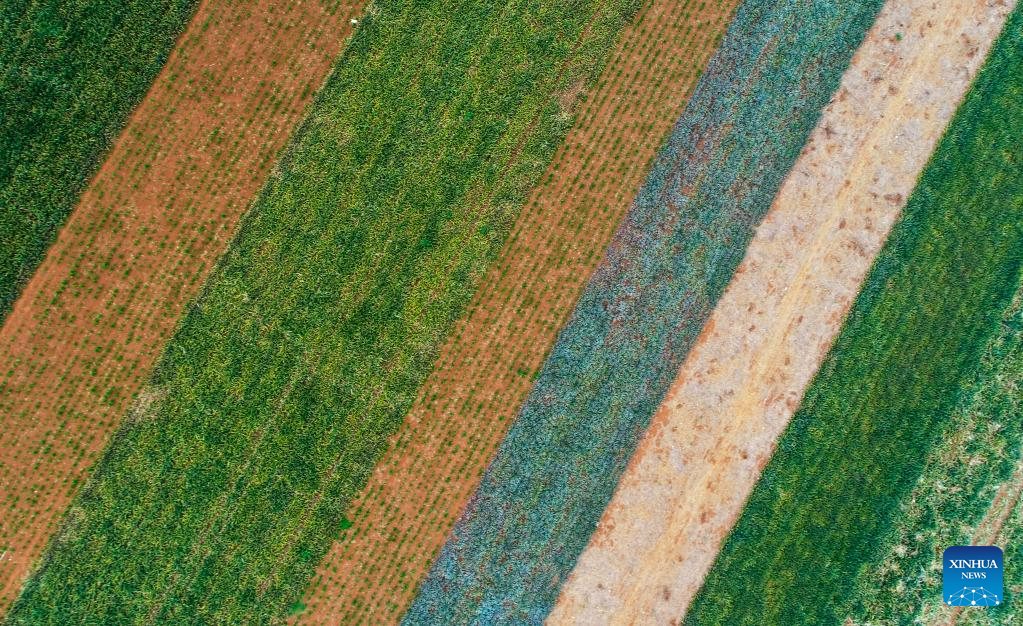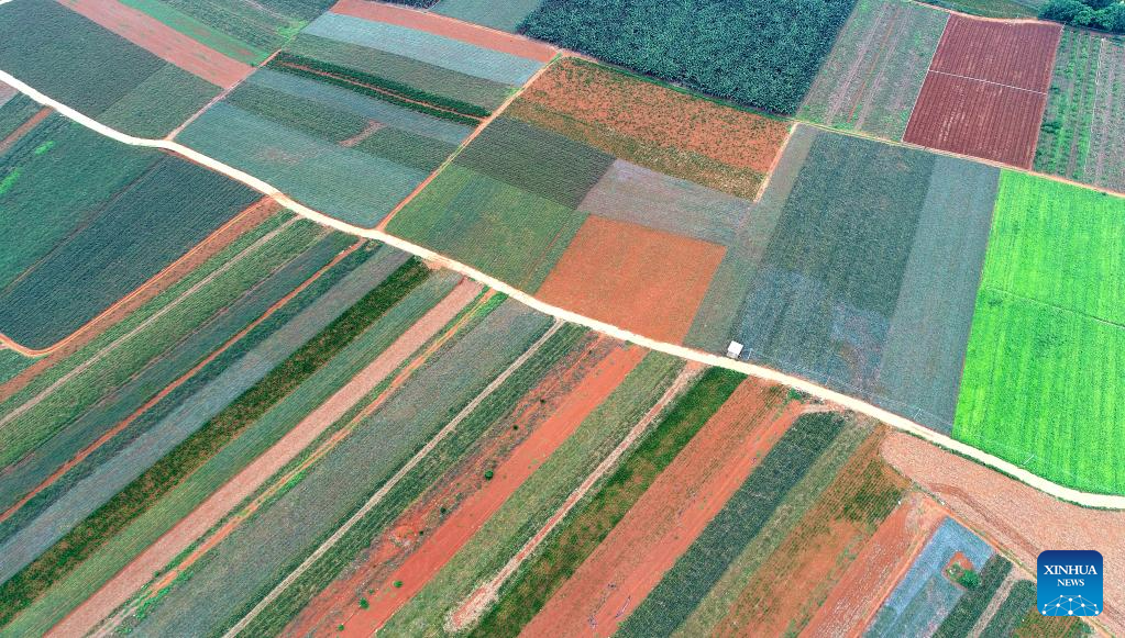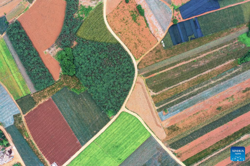 This aerial photo taken on May 26, 2023 shows the fields which are mainly planted with pineapples in Qujie Township of Xuwen County, Zhanjiang City, south China's Guangdong Province. Xuwen County is a major producer of pineapples, with a planting area of more than 350,000 mu (23,333 hectares). (Xinhua/Liang Xu)