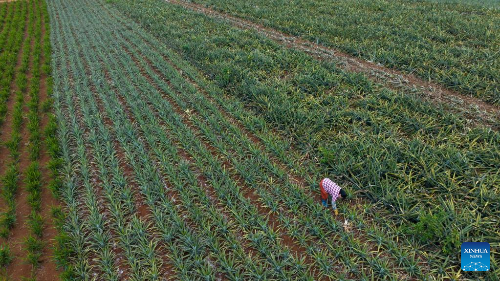 This aerial photo taken on May 26, 2023 shows a farmer working in the field of pineapples in Qujie Township of Xuwen County, Zhanjiang City, south China's Guangdong Province. Xuwen County is a major producer of pineapples, with a planting area of more than 350,000 mu (23,333 hectares). (Xinhua/Mao Siqian)