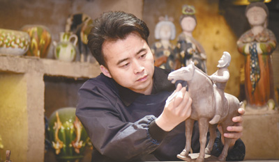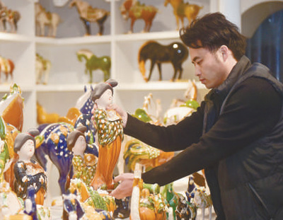 Zhang Yipeng sorts his Tang tri-colored glazed pottery artworks. (cpanet.cn/Huang Zhengwei)