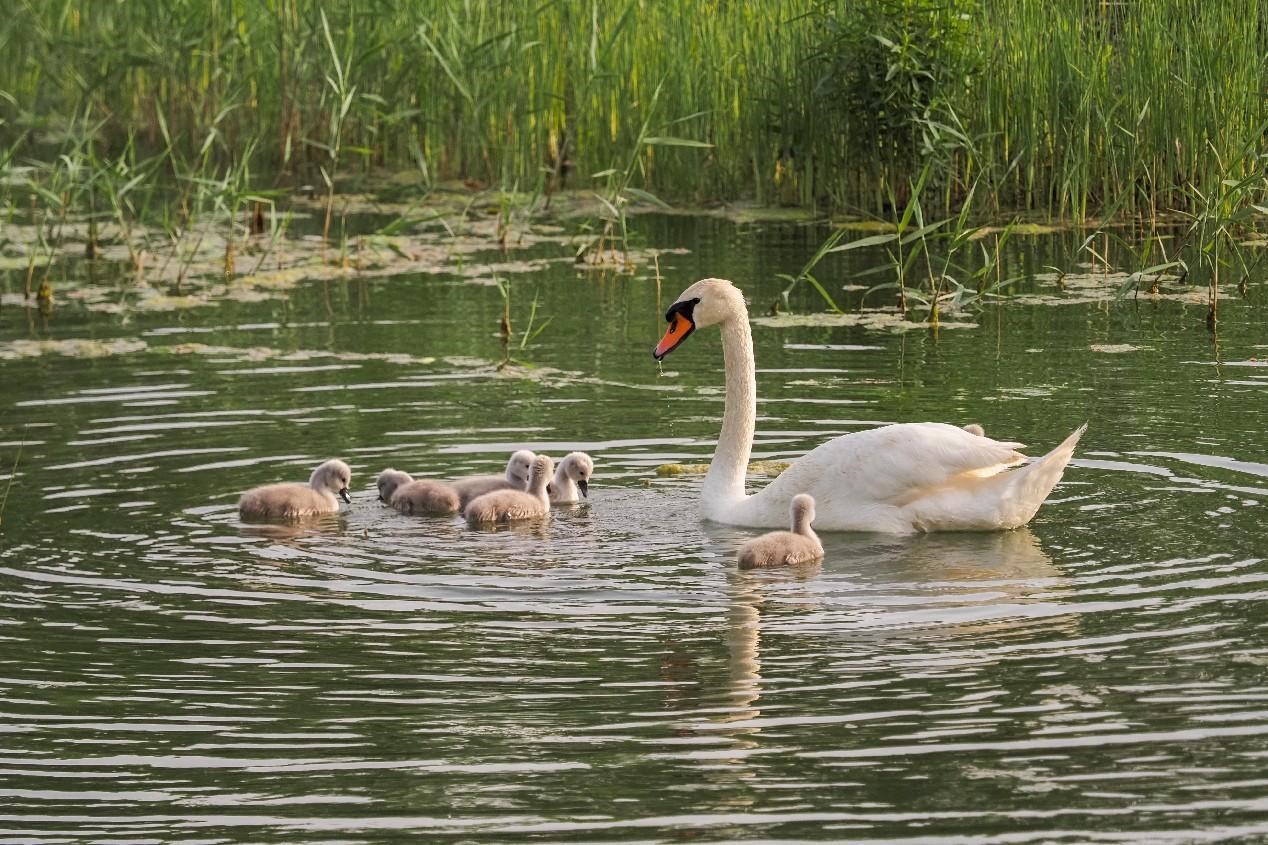 Photo taken on April 16, 2023 shows a mute swan and its babies in a wetland park in Zhengzhou, central China's Henan province. (People's Daily Online/Yang Xiaopeng)