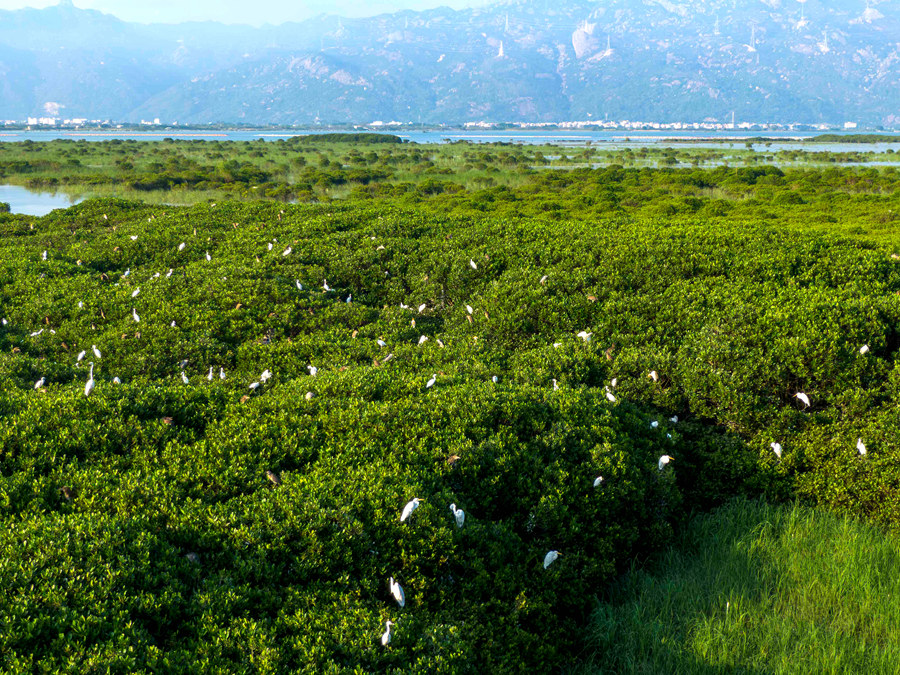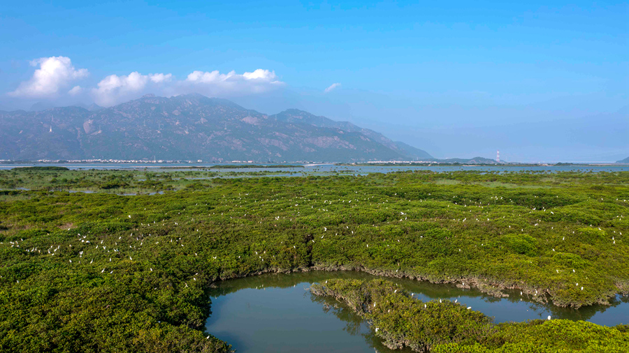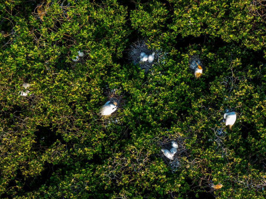 Photo shows egrets atop mangrove trees at a mangrove national nature reserve in the Zhangjiang River estuary, southeast China's Fujian Province. (Photo/Fang Wei)