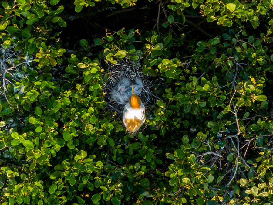 An egret takes care of its chicks atop a mangrove tree at a mangrove national nature reserve in the Zhangjiang River estuary, southeast China's Fujian Province. (Photo/Fang Wei)