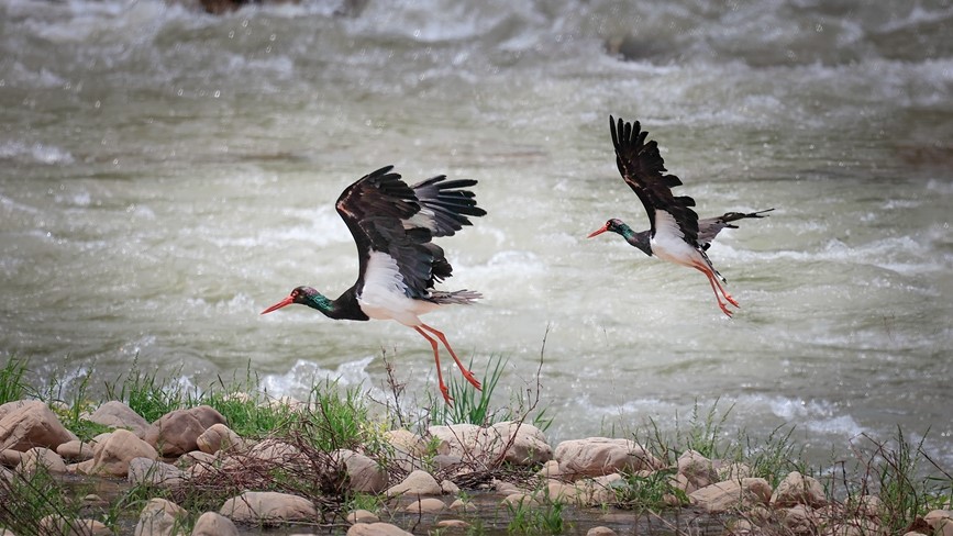 Black storks fly in Henan Anyang Zhanghe Canyon National Wetlands Park in Anyang city, central China's Henan Province. (Photo/Duan Xianzhong)
