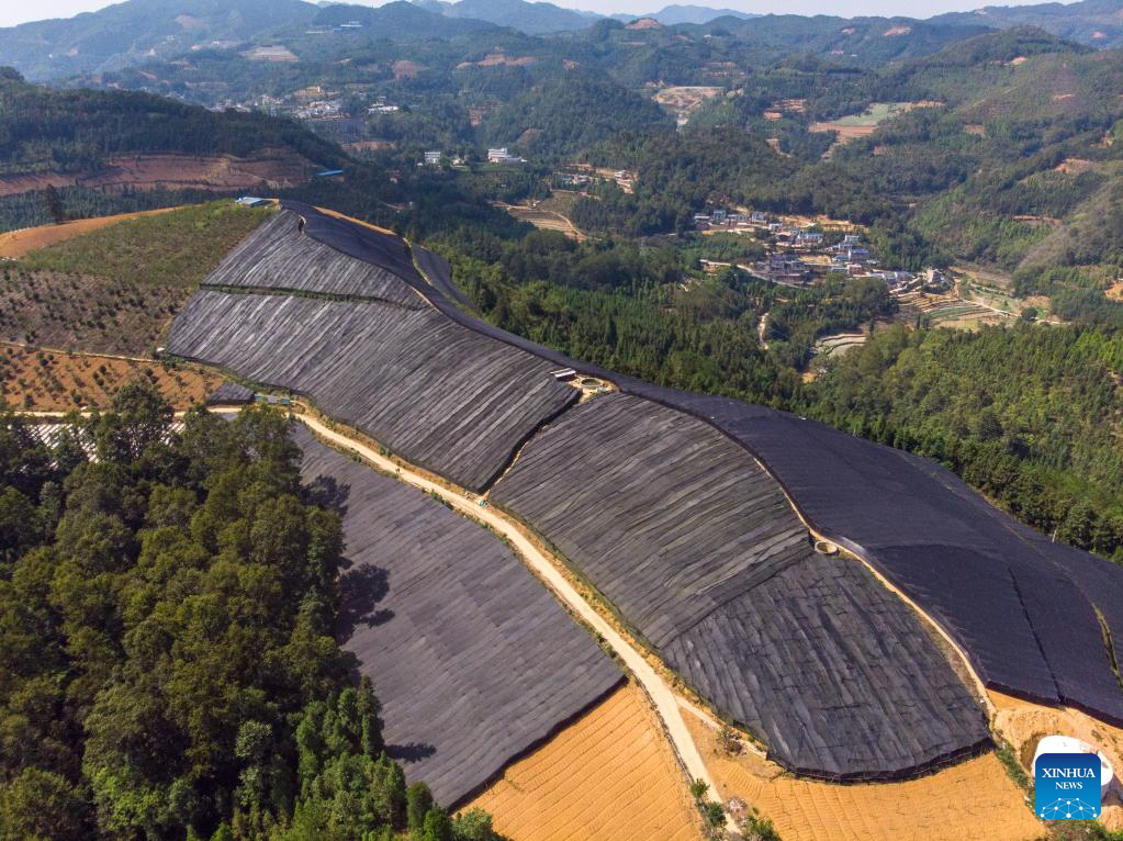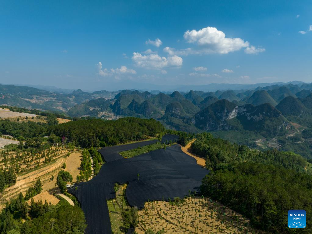 This aerial photo shows a panax notoginseng cultivation base in Lianhuatang Township of Xichou County, Wenshan Zhuang and Miao Autonomous Prefecture, southwest China's Yunnan Province, May 31, 2023.?(Xinhua/Jiang Wenyao)