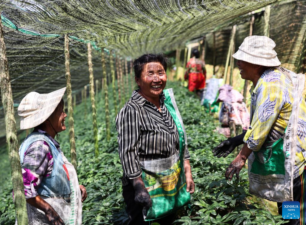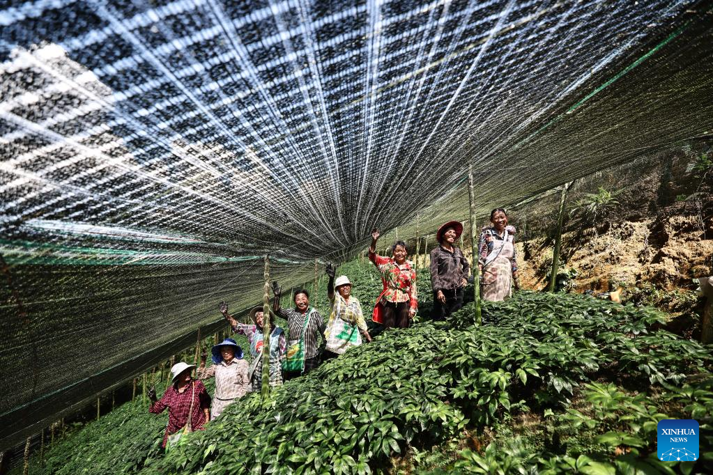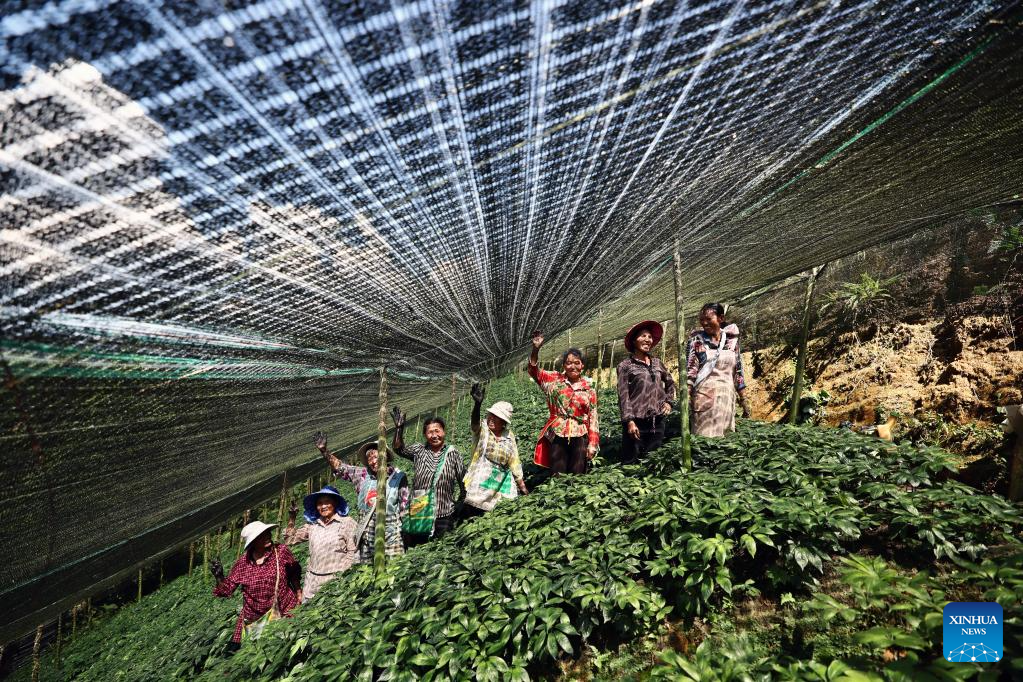Farmers are pictured at a panax notoginseng cultivation base in Lianhuatang Township of Xichou County, Wenshan Zhuang and Miao Autonomous Prefecture, southwest China's Yunnan Province, May 31, 2023.?(Xinhua/Lan Hongguang)