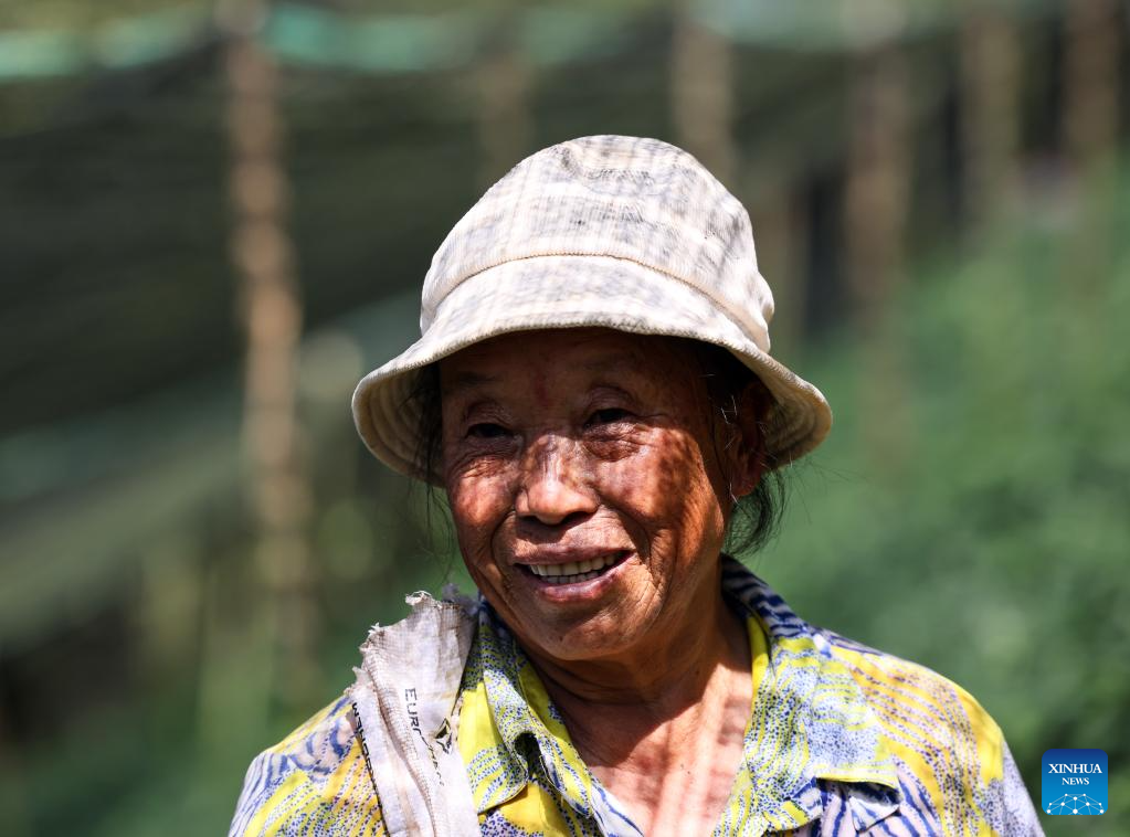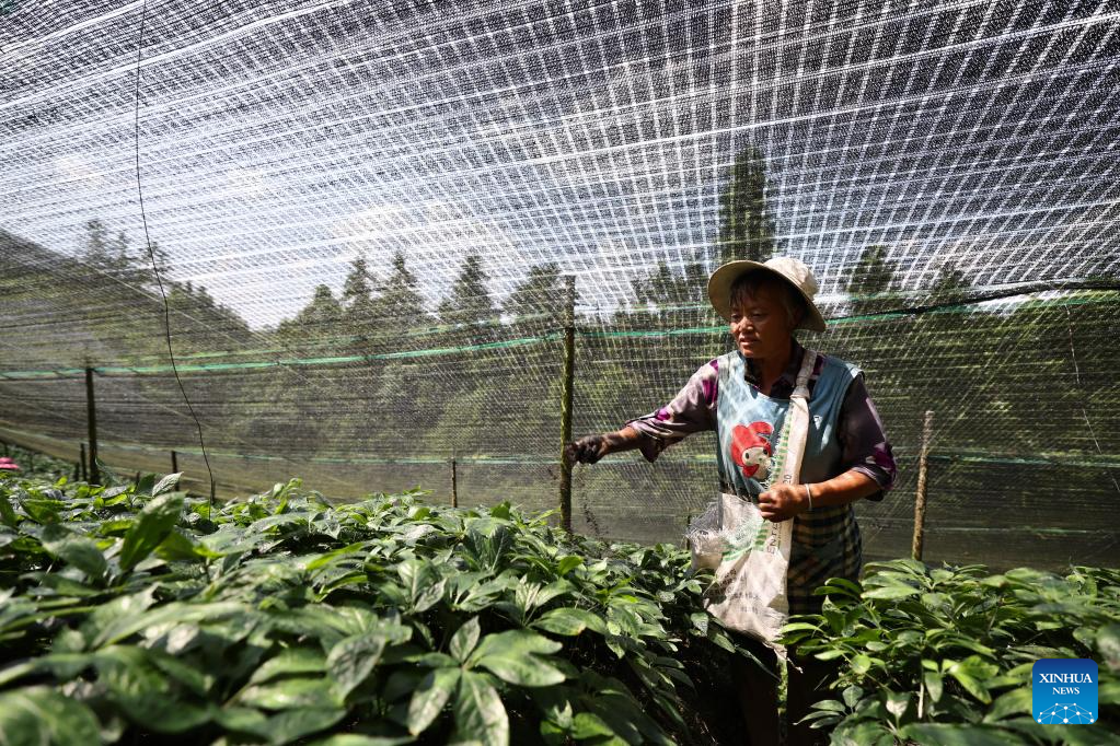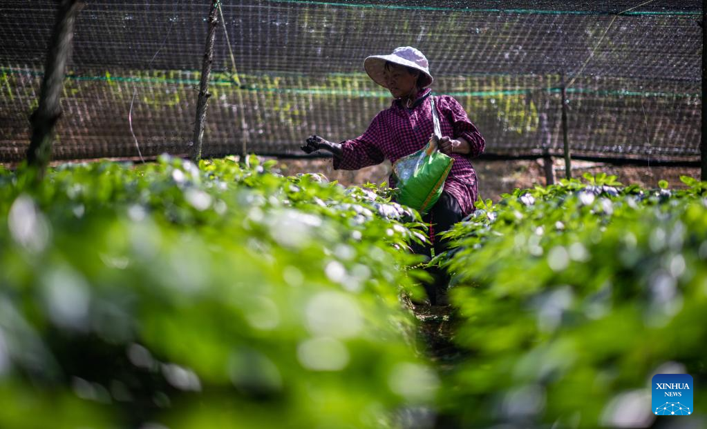 A farmer is pictured at a panax notoginseng cultivation base in Lianhuatang Township of Xichou County, Wenshan Zhuang and Miao Autonomous Prefecture, southwest China's Yunnan Province, May 31, 2023.?(Xinhua/Lan Hongguang)