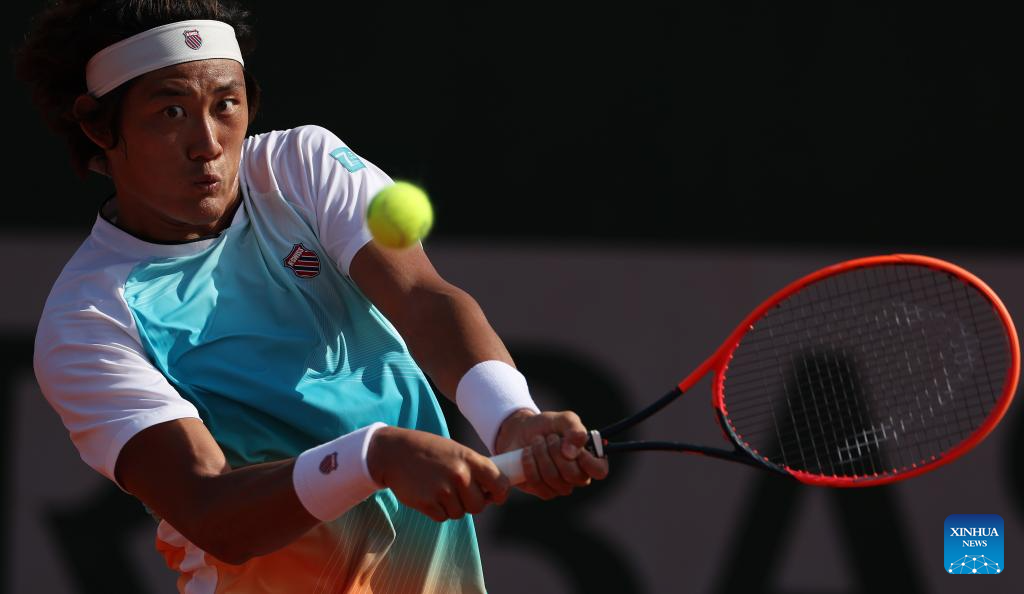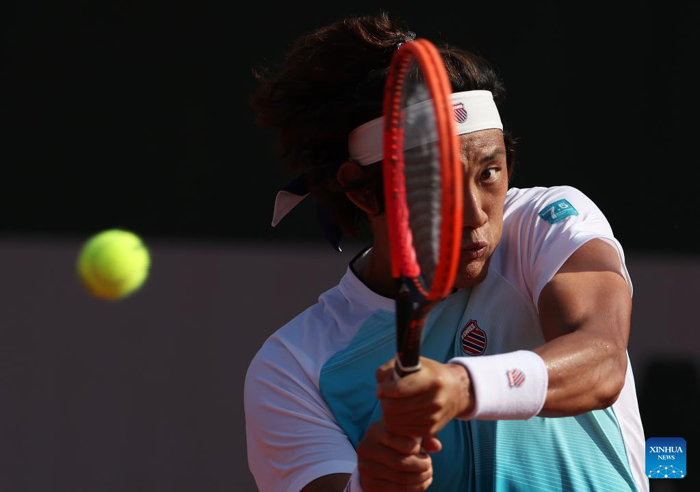 Zhang Zhizhen of China competes during the men's singles second round match between Zhang Zhizhen of China and Thiago Agustin Tirante of Argentina at the French Open tennis tournament at Roland Garros in Paris, France, on June 1, 2023. (Xinhua/Gao Jing)