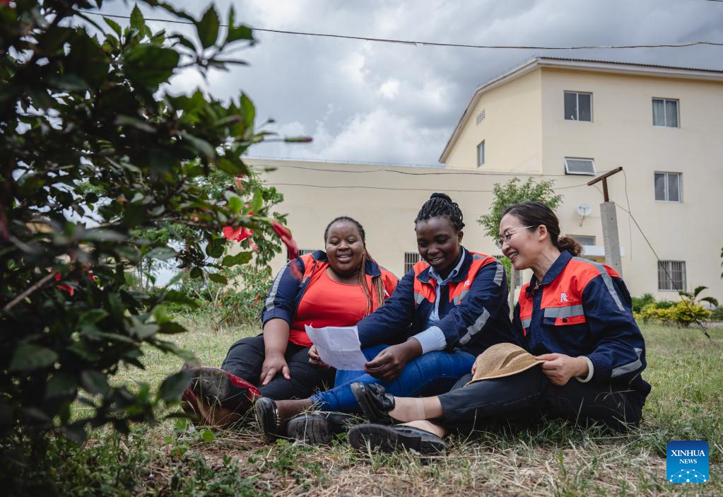 Chinese instructor Chen Ling (R) teaches her apprentices to sing Chinese songs during work break in Nairobi, Kenya, May 23, 2023. (Xinhua/Wang Guansen)