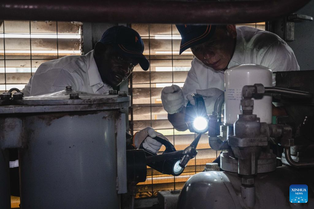 Chinese instructor Mao Xin (R) works with apprentice Peter Njenga at the Nairobi Station of the Mombasa-Nairobi Railway in Nairobi, Kenya, May 23, 2023. (Xinhua/Wang Guansen)?