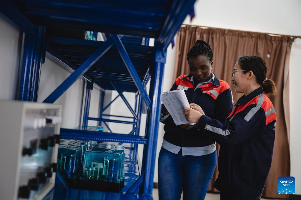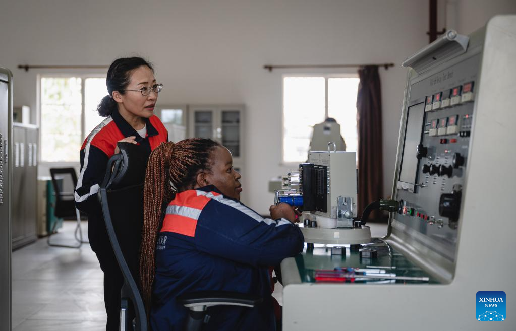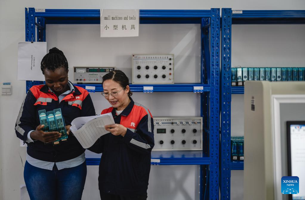 Chinese instructor Chen Ling (L) instructs apprentice Judith Wanzila Peter on operating electrical devices in Nairobi, Kenya, May 23, 2023. (Xinhua/Wang Guansen)