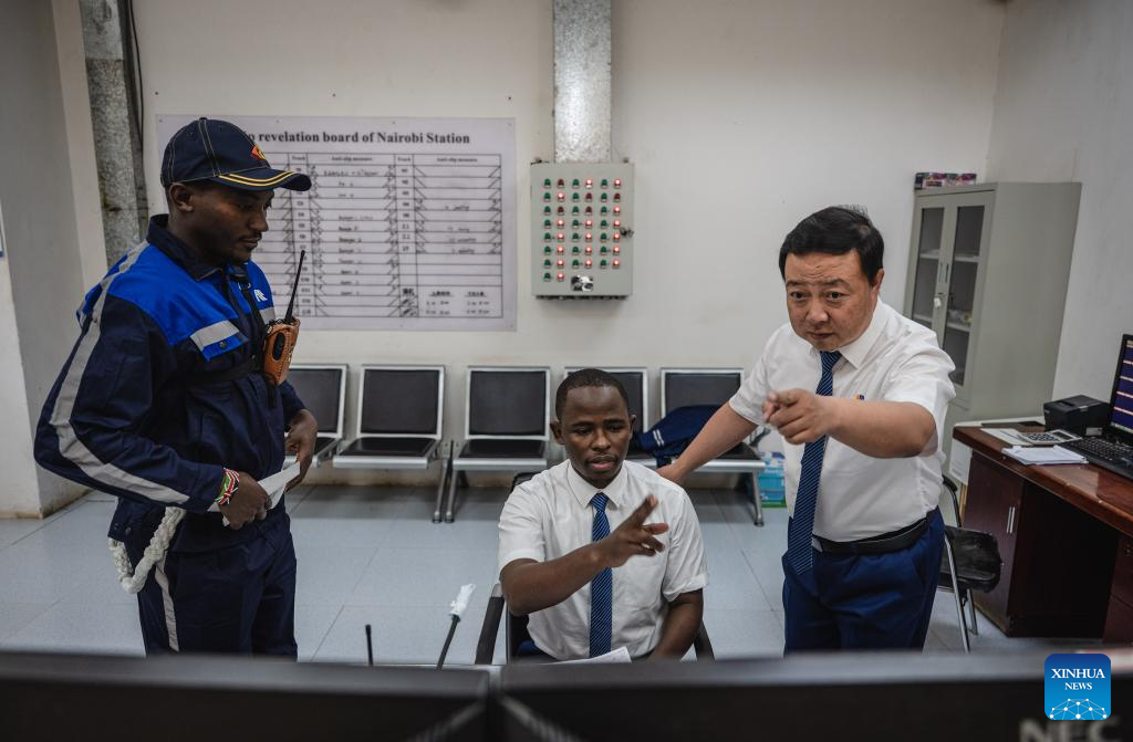 Chinese instructor Mao Xin (R) talks with colleagues at the Nairobi Station of the Mombasa-Nairobi Railway in Nairobi, Kenya, May 23, 2023. (Xinhua/Wang Guansen)