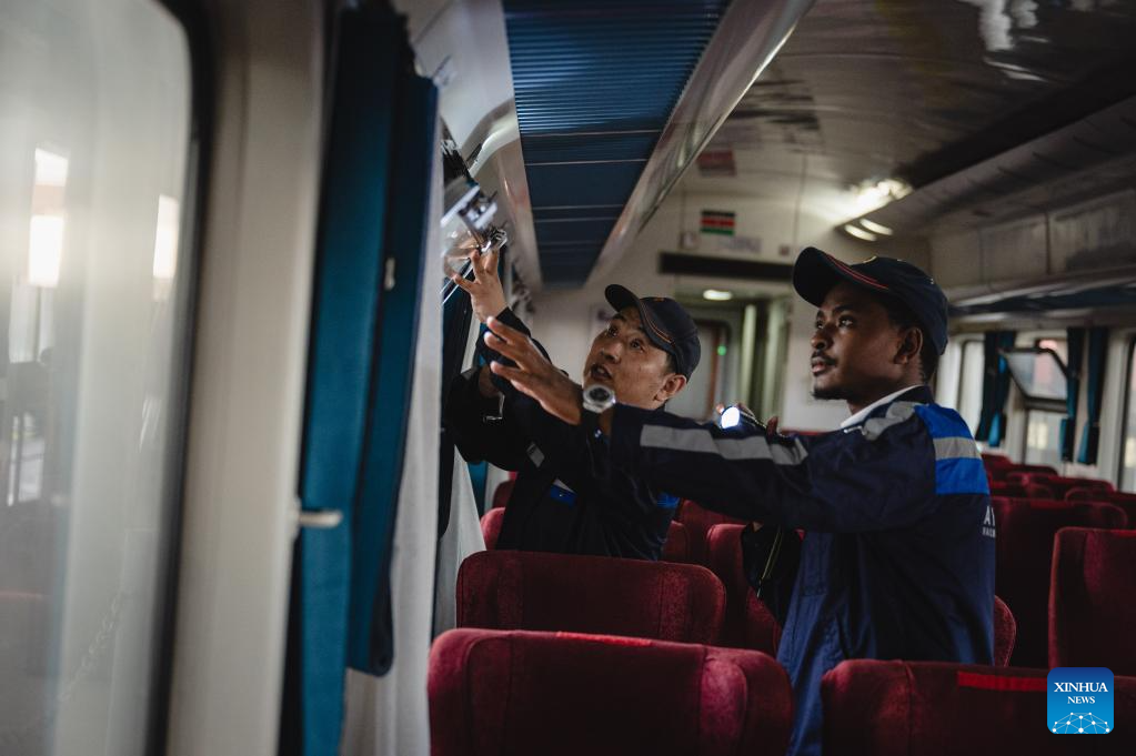Chinese instructor Wu Tongming (L) and apprentice Boniface Kirumwa inspect a train on Mombasa-Nairobi Railway in Nairobi, Kenya, May 23, 2023. (Xinhua/Wang Guansen)