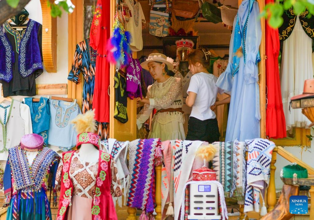 Tourists select traditional costumes on Liuxing Street in Yining City, Ili Kazak Autonomous Prefecture, northwest China's Xinjiang Uygur Autonomous Region, May 17, 2023. According to comprehensive calculation through a big data platform for tourism statistics and sample survey, from January to April 2023, Xinjiang received over 51.19 million tourists, a year-on-year increase of 29.56%. Meanwhile, tourism revenue reached 42.64 billion yuan (about 6.03 billion U.S. dollars), up 60.59% year on year. (Xinhua/Wang Fei)