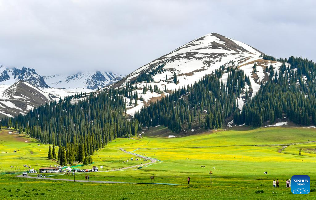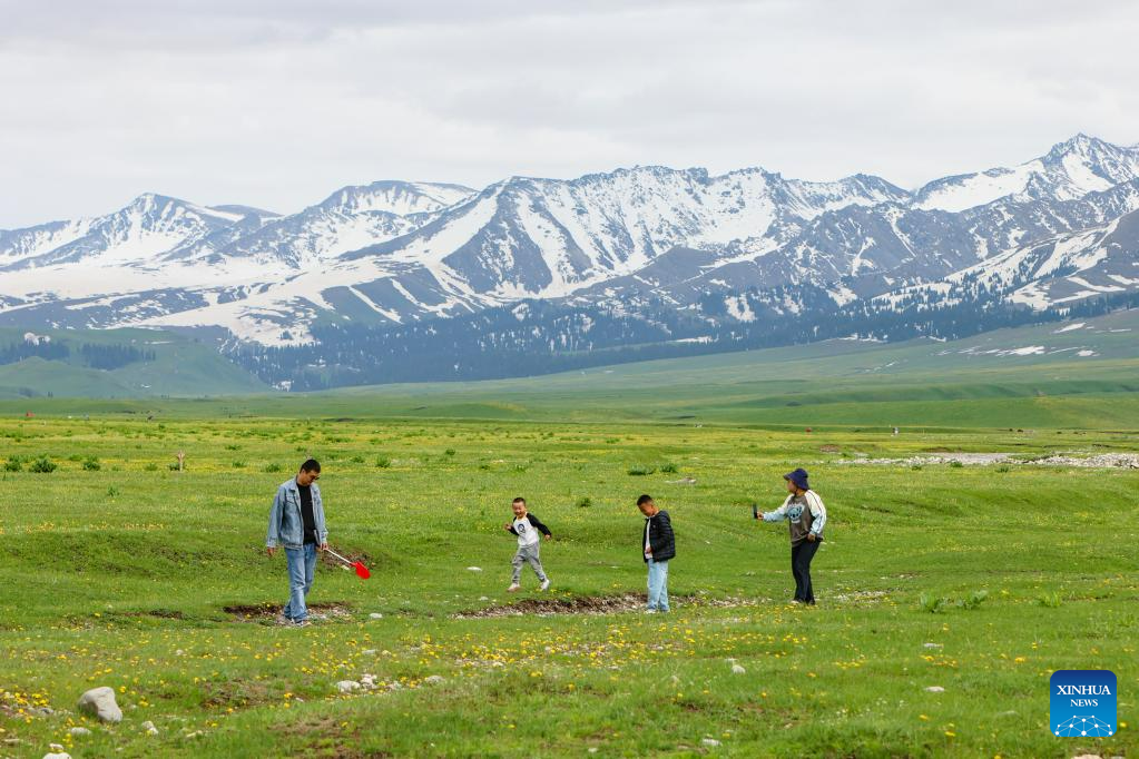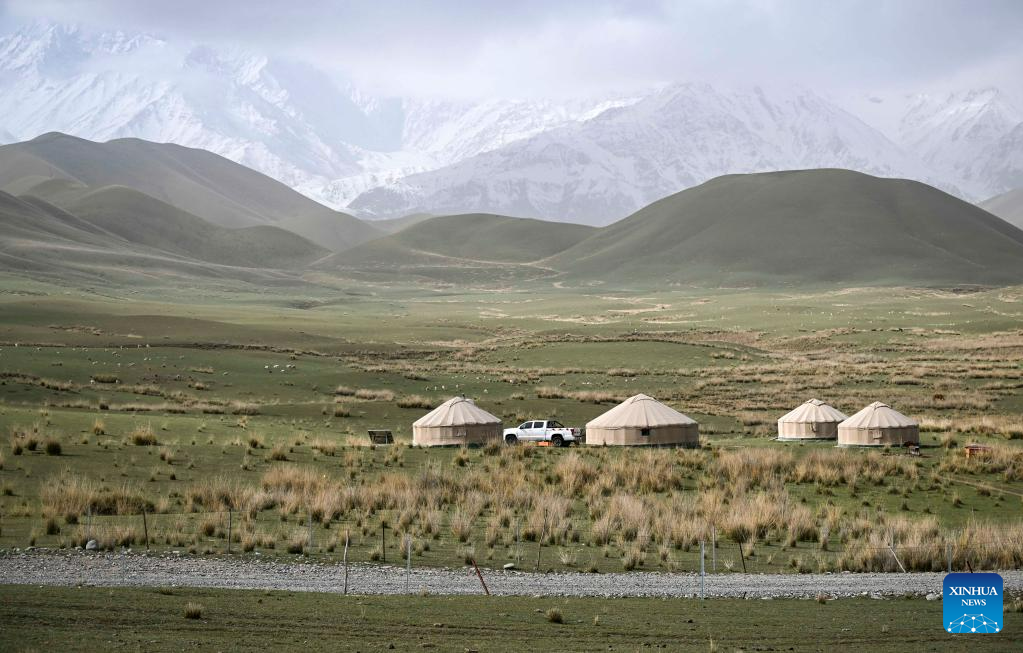 This photo taken on May 31, 2023 shows an alpine pasture in the Kunlun Mountains area in Qira County of Hotan Prefecture, northwest China's Xinjiang Uygur Autonomous Region. According to comprehensive calculation through a big data platform for tourism statistics and sample survey, from January to April 2023, Xinjiang received over 51.19 million tourists, a year-on-year increase of 29.56%. Meanwhile, tourism revenue reached 42.64 billion yuan (about 6.03 billion U.S. dollars), up 60.59% year on year. (Xinhua/Hu Huhu)