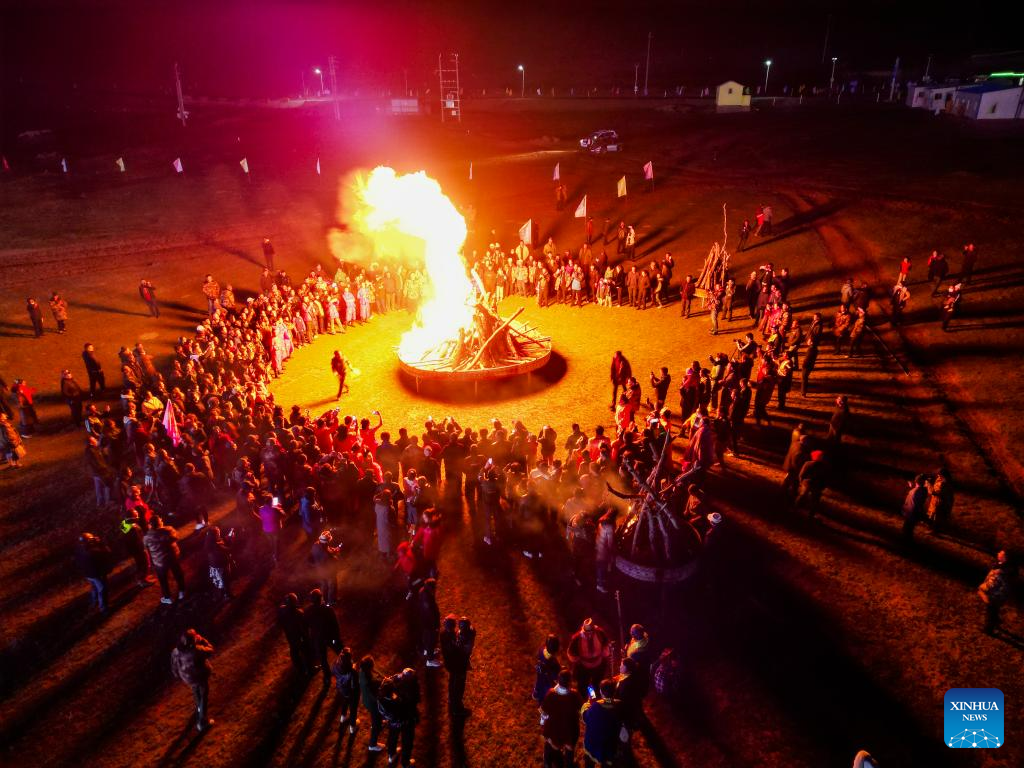 This aerial photo taken on May 30, 2023 shows tourists participating in a bonfire party at a scenic area in Qira County of Hotan Prefecture, northwest China's Xinjiang Uygur Autonomous Region. According to comprehensive calculation through a big data platform for tourism statistics and sample survey, from January to April 2023, Xinjiang received over 51.19 million tourists, a year-on-year increase of 29.56%. Meanwhile, tourism revenue reached 42.64 billion yuan (about 6.03 billion U.S. dollars), up 60.59% year on year. (Xinhua/Hao Zhao)