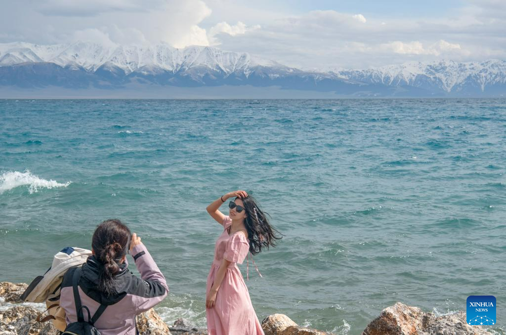 A tourist poses for photos by the Sayram Lake in northwest China's Xinjiang Uygur Autonomous Region, May 21, 2023. According to comprehensive calculation through a big data platform for tourism statistics and sample survey, from January to April 2023, Xinjiang received over 51.19 million tourists, a year-on-year increase of 29.56%. Meanwhile, tourism revenue reached 42.64 billion yuan (about 6.03 billion U.S. dollars), up 60.59% year on year. (Xinhua/Wang Fei)