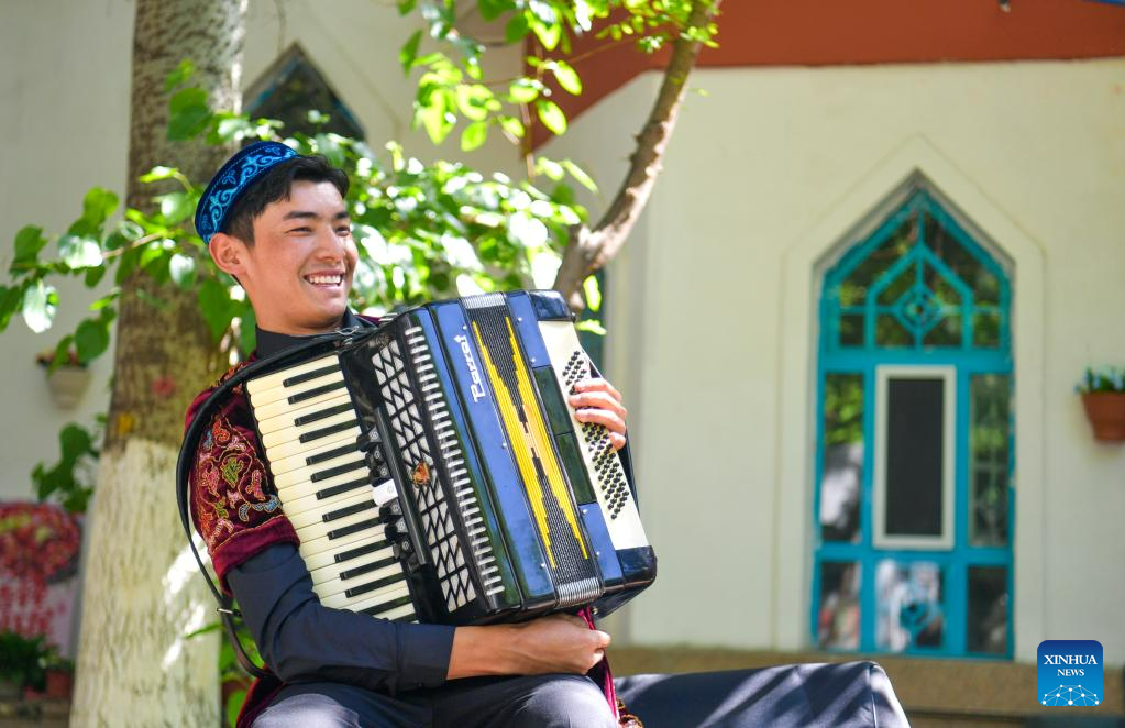 A musician prepares to play accordion on Liuxing Street in Yining City, Ili Kazak Autonomous Prefecture, northwest China's Xinjiang Uygur Autonomous Region, May 17, 2023. According to comprehensive calculation through a big data platform for tourism statistics and sample survey, from January to April 2023, Xinjiang received over 51.19 million tourists, a year-on-year increase of 29.56%. Meanwhile, tourism revenue reached 42.64 billion yuan (about 6.03 billion U.S. dollars), up 60.59% year on year. (Xinhua/Wang Fei)