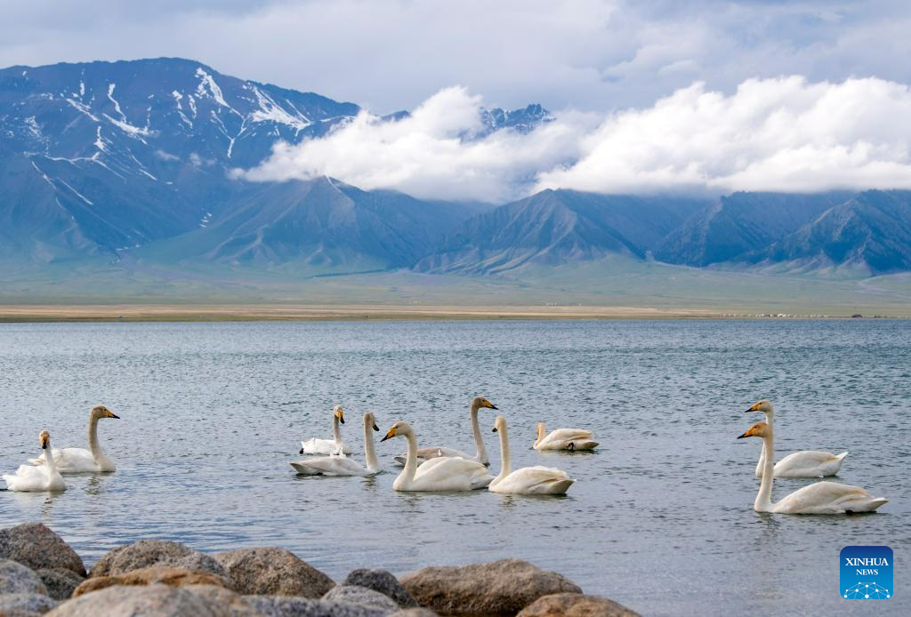 Swans are seen in the Sayram Lake in northwest China's Xinjiang Uygur Autonomous Region, May 21, 2023. According to comprehensive calculation through a big data platform for tourism statistics and sample survey, from January to April 2023, Xinjiang received over 51.19 million tourists, a year-on-year increase of 29.56%. Meanwhile, tourism revenue reached 42.64 billion yuan (about 6.03 billion U.S. dollars), up 60.59% year on year. (Xinhua/Wang Fei)