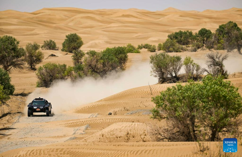 Racers participate in the 2023 Taklimakan Rally in the desert in Moyu County of Hotan Prefecture, northwest China's Xinjiang Uygur Autonomous Region, May 28, 2023. According to comprehensive calculation through a big data platform for tourism statistics and sample survey, from January to April 2023, Xinjiang received over 51.19 million tourists, a year-on-year increase of 29.56%. Meanwhile, tourism revenue reached 42.64 billion yuan (about 6.03 billion U.S. dollars), up 60.59% year on year. (Xinhua/Hu Huhu)