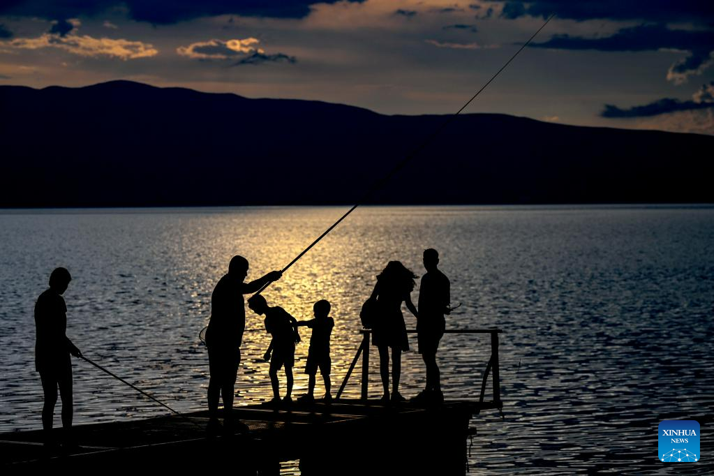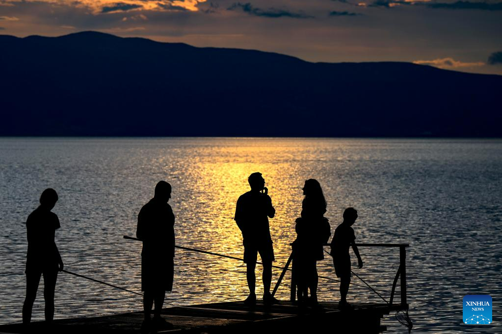People are silhouetted against sunset at the dock of Ohrid Lake in Ohrid, North Macedonia, on June 2, 2023. (Photo by Tomislav Georgiev/Xinhua)