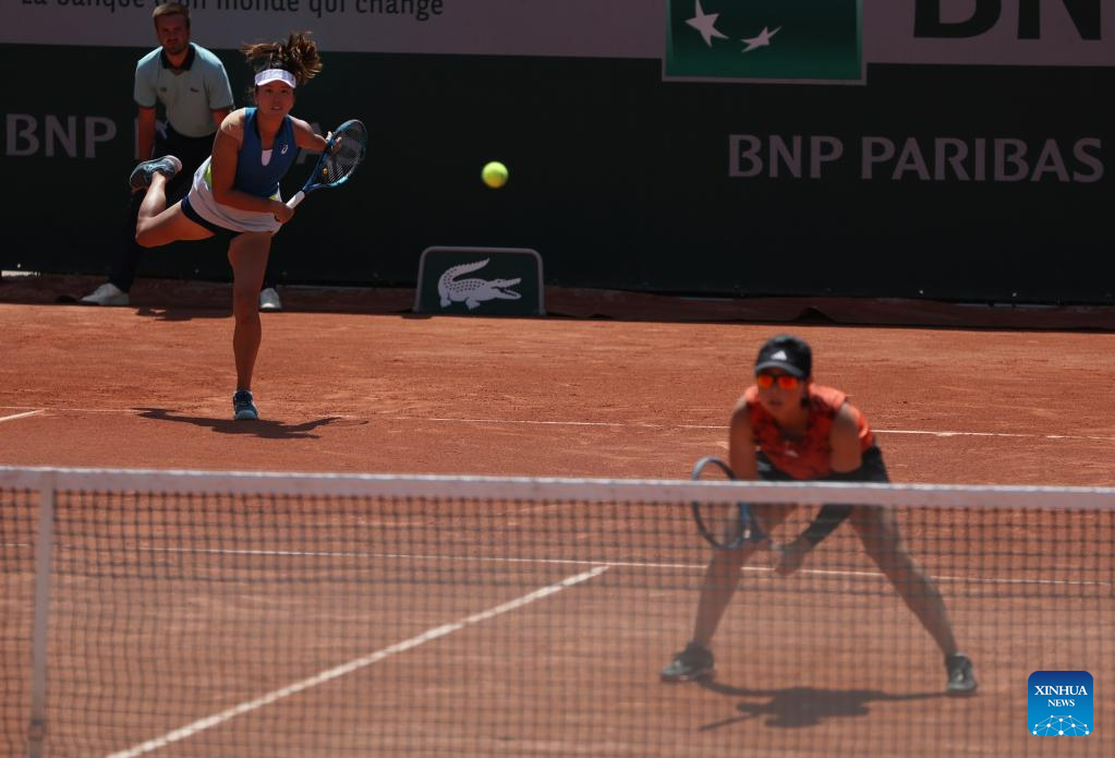Xu Yifan (R)/Yang Zhaoxuan of China compete during the women's doubles second round match between Xu Yifan/Yang Zhaoxuan of China and Ysaline Bonaventure (Belgium)/Panna Udvardy (Hungary) at the French Open tennis tournament at Roland Garros in Paris, France, on June 2, 2023. (Xinhua/Gao Jing)