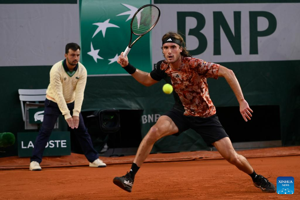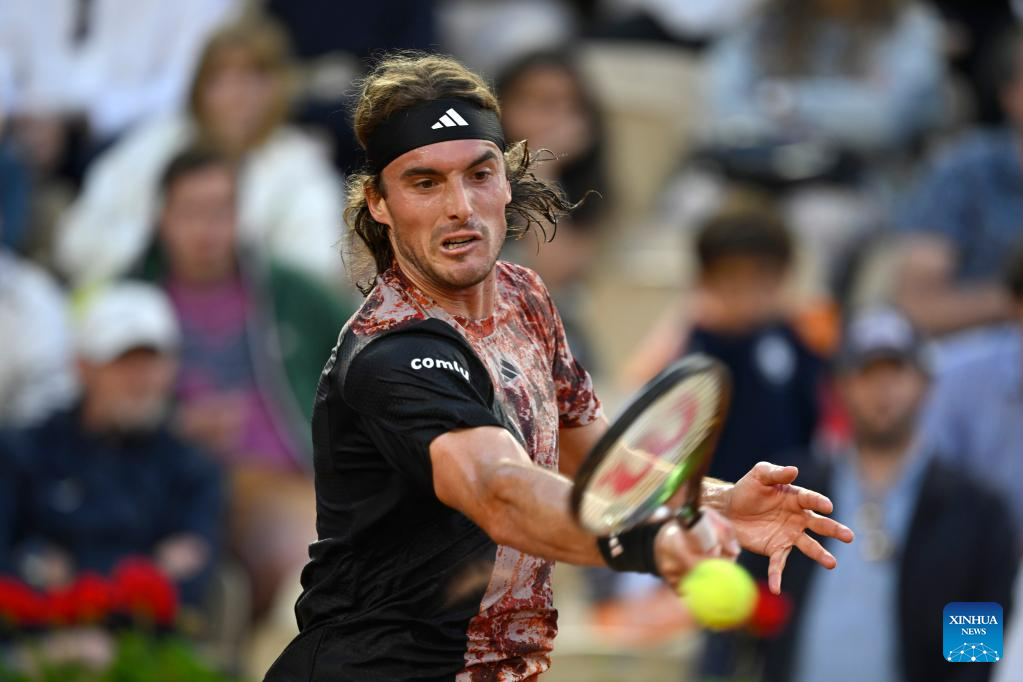 Stefanos Tsitsipas of Greece hits a return during the men's singles third round match between Stefanos Tsitsipas of Greece and Diego Schwartzman of Argentina at the French Open tennis tournament at Roland Garros in Paris, France, on June 2, 2023. (Photo by Julien Mattia/Xinhua)