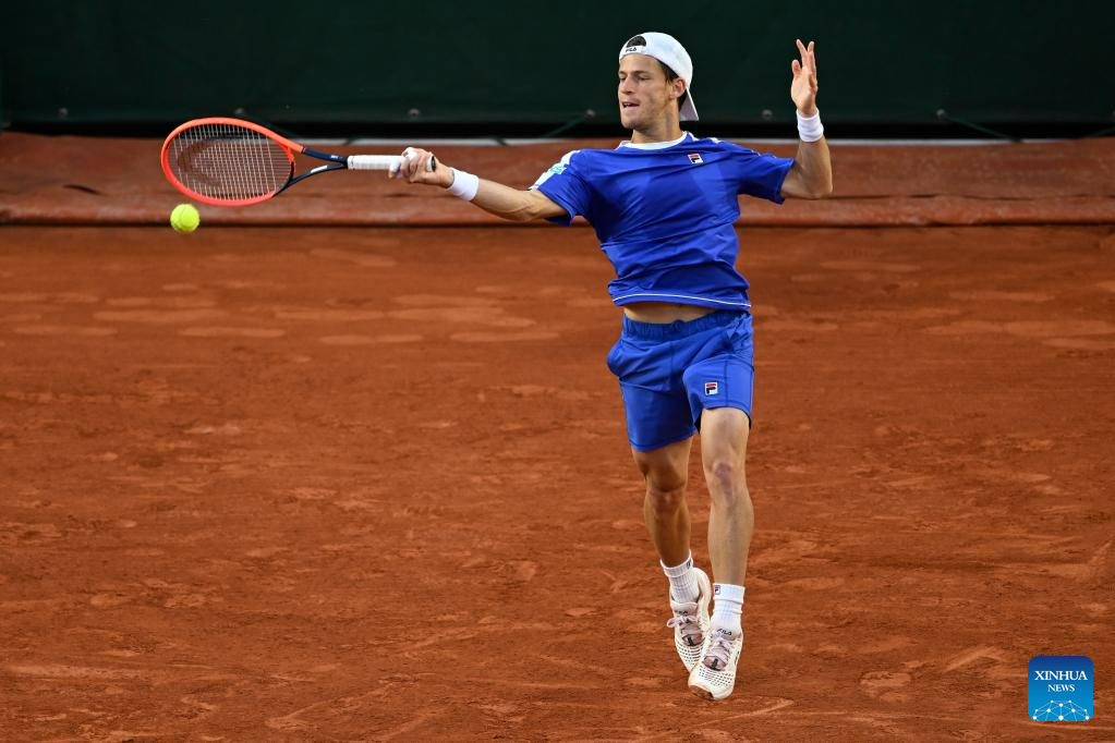 Diego Schwartzman of Argentina hits a return during the men's singles third round match between Stefanos Tsitsipas of Greece and Diego Schwartzman of Argentina at the French Open tennis tournament at Roland Garros in Paris, France, on June 2, 2023. (Photo by Julien Mattia/Xinhua)