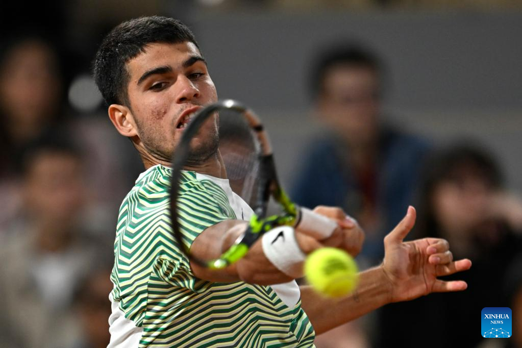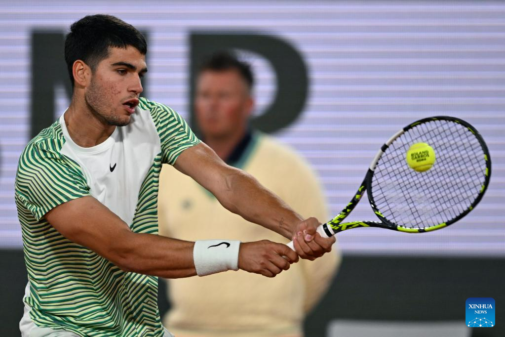 Carlos Alcaraz of Spain hits a return during the men's singles third round match between Carlos Alcaraz of Spain and Denis Shapovalov of Canada at the French Open tennis tournament at Roland Garros in Paris, France, on June 2, 2023. (Photo by Julien Mattia/Xinhua)