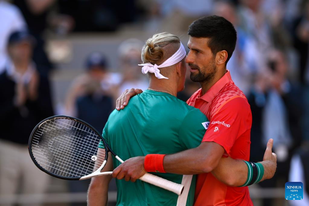 Novak Djokovic (R) of Serbia greets Alejandro Davidovich Fokina of Spain after their men's singles third round match at the French Open tennis tournament at Roland Garros in Paris, France, on June 2, 2023. (Xinhua/Gao Jing)