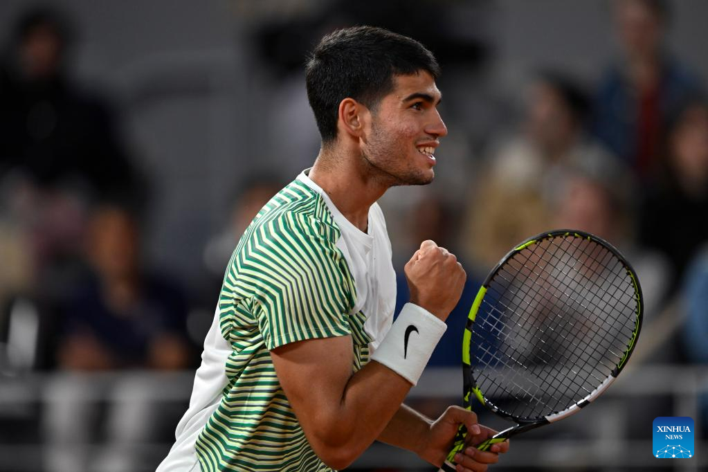 Carlos Alcaraz of Spain celebrates during the men's singles third round match between Carlos Alcaraz of Spain and Denis Shapovalov of Canada at the French Open tennis tournament at Roland Garros in Paris, France, on June 2, 2023. (Photo by Julien Mattia/Xinhua)