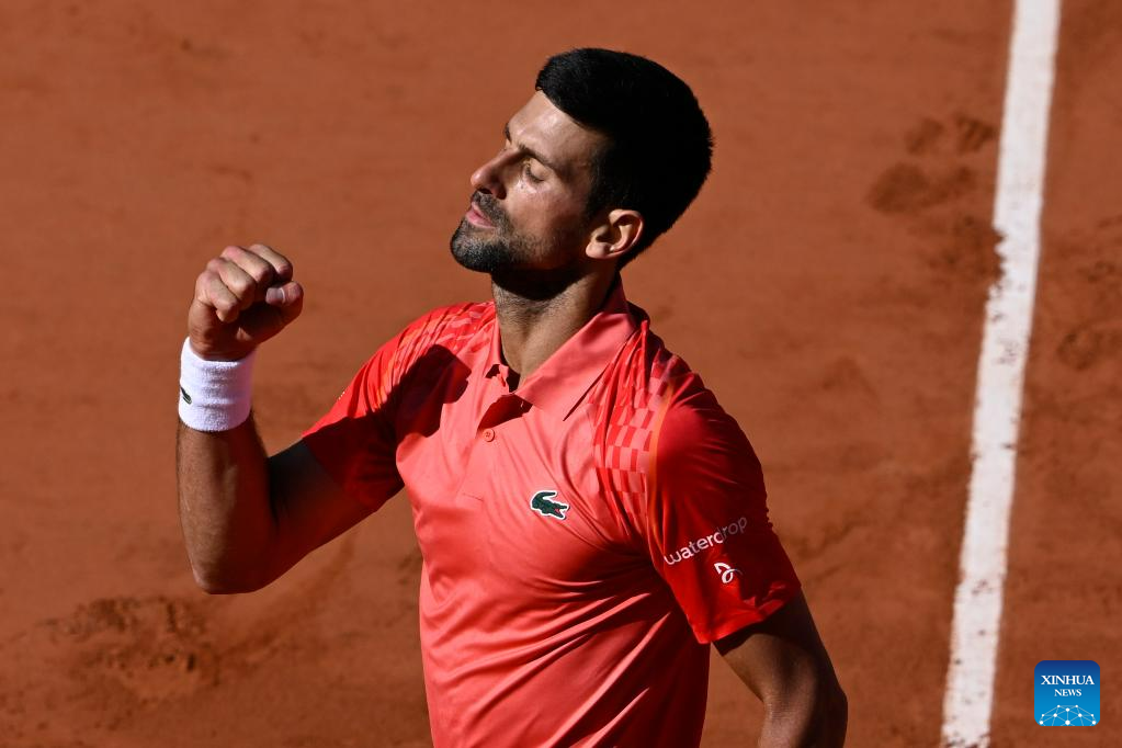 Novak Djokovic of Serbia celebrates during the men's singles third round match between Novak Djokovic of Serbia and Alejandro Davidovich Fokina of Spain at the French Open tennis tournament at Roland Garros in Paris, France, on June 2, 2023. (Photo by Julien Mattia/Xinhua)