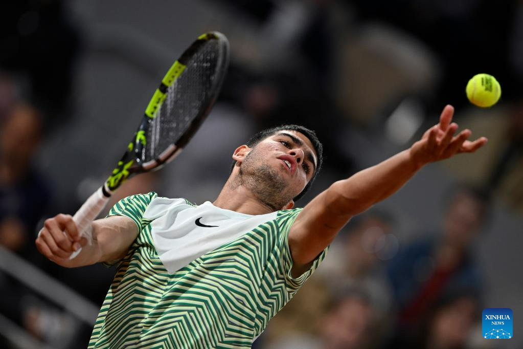 Carlos Alcaraz of Spain serves during the men's singles third round match between Carlos Alcaraz of Spain and Denis Shapovalov of Canada at the French Open tennis tournament at Roland Garros in Paris, France, on June 2, 2023. (Photo by Julien Mattia/Xinhua)