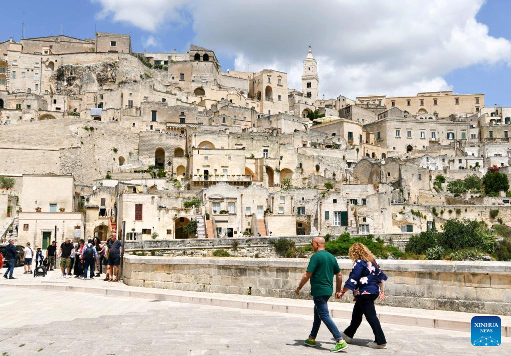 Tourists visit the Sassi of Matera in the southern region of Basilicata, Italy, June 1, 2023. Matera's Sassi and Park of the Rupestrian Churches were inscribed on the UNESCO World Heritage List in 1993. (Xinhua/Jin Mamengni)