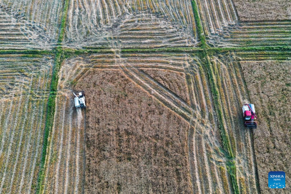 - Harvesters reap wheat in Jingjiang, E China's Jiangsu Province