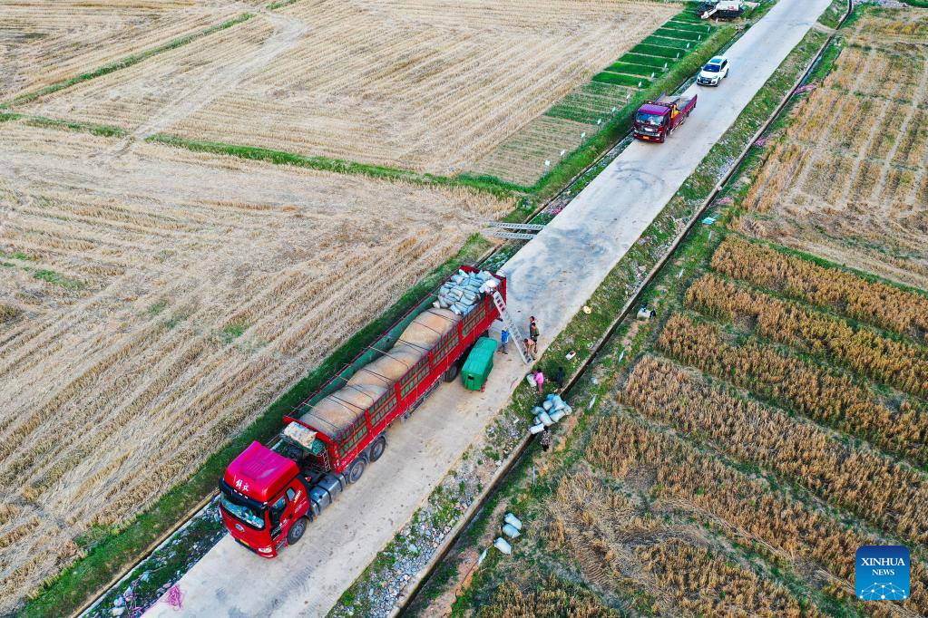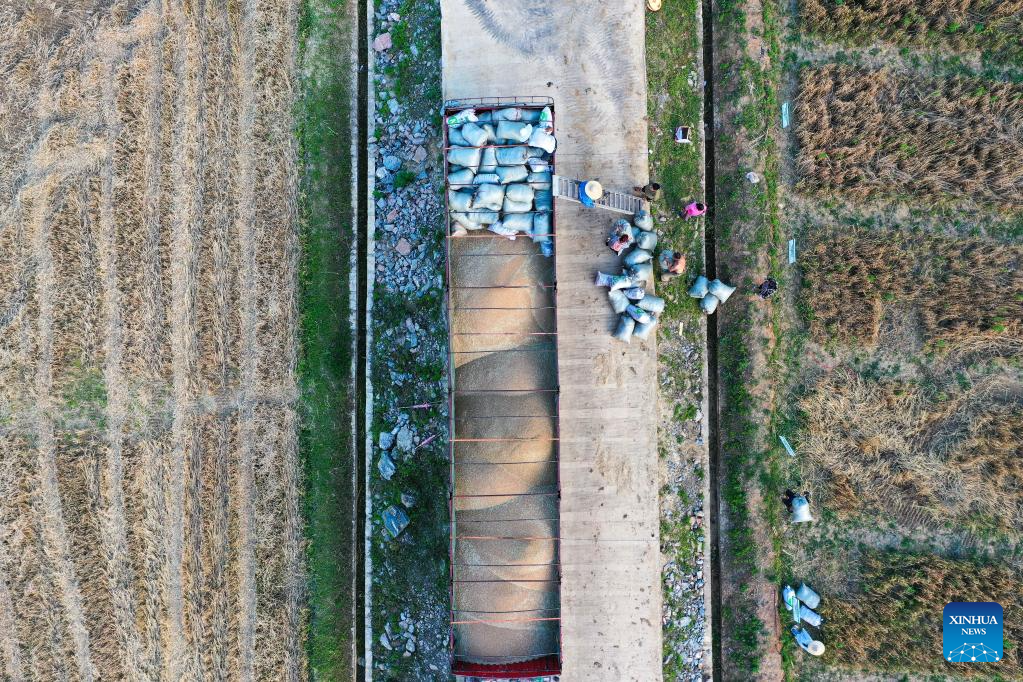 This aerial photo shows farmers loading sacks of newly-harvested wheat into a truck at Yantang Village of Kaiyang County in Guiyang, southwest China's Guizhou Province, May 31, 2023. (Xinhua/Yang Wenbin)