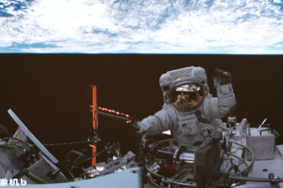 This screen image captured at Beijing Aerospace Control Center on April 15, 2023 shows Shenzhou-15 taikonaut Zhang Lu waving after performing extravehicular activities outside the Wentian lab module. (Xinhua/Guo Zhongzheng)