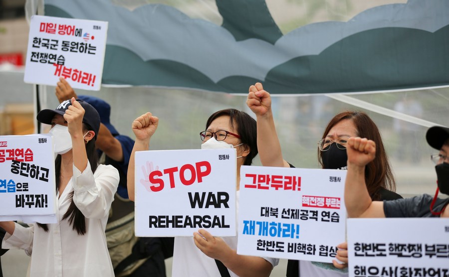 Protestors hold a rally against the South Korea-U.S. military exercise in central Seoul, South Korea, Aug. 22, 2022. (Xinhua/Wang Yiliang)