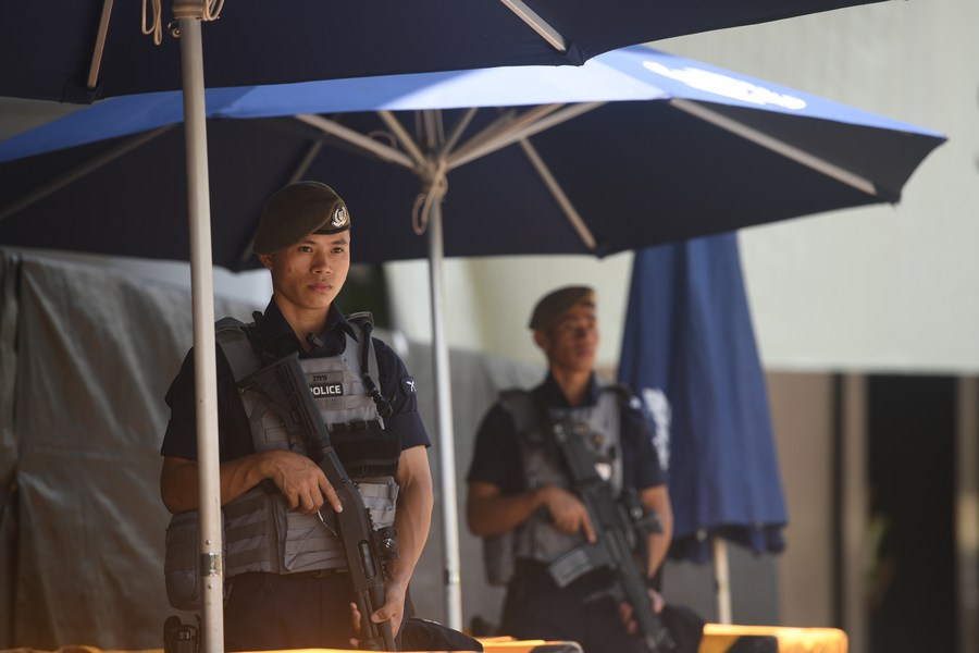 Policemen stand guard near the venue of the 20th Shangri-La Dialogue at Singapore's Shangri-La Hotel on June 2, 2023. (Photo by Then Chih Wey/Xinhua)