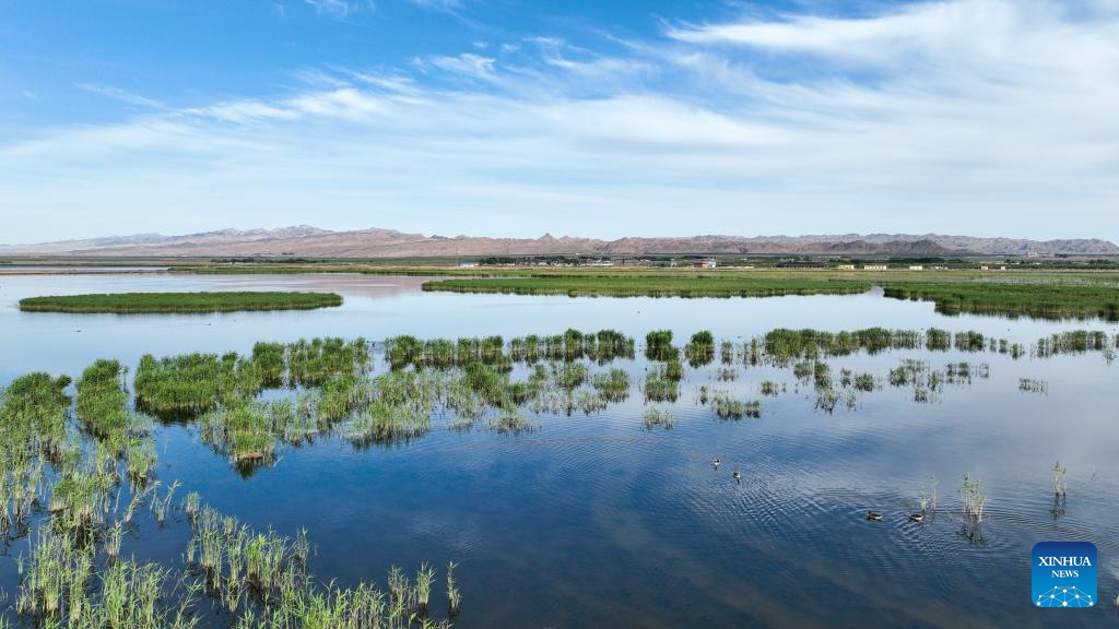 This aerial photo taken on June 4, 2023 shows the scenery of Ulan Suhai Lake in Urad Front Banner in Bayannur, north China's Inner Mongolia Autonomous Region. (Xinhua/Bei He)