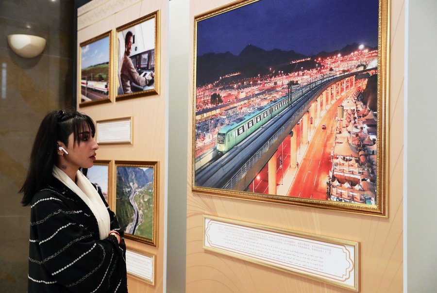 A woman visits a photo exhibition showcasing the friendly exchanges and cooperation between China and Arab countries in Riyadh, Saudi Arabia, Dec. 7, 2022. (Xinhua/Wang Dongzhen)