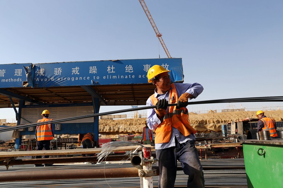 People work on the construction site of China State Construction Engineering Corporation (CSCEC)'s Central Business District (CBD) project in Egypt's New Administrative Capital, about 50 kilometers east of Cairo, on June 1, 2019. (Xinhua/Ahmed Gomaa)