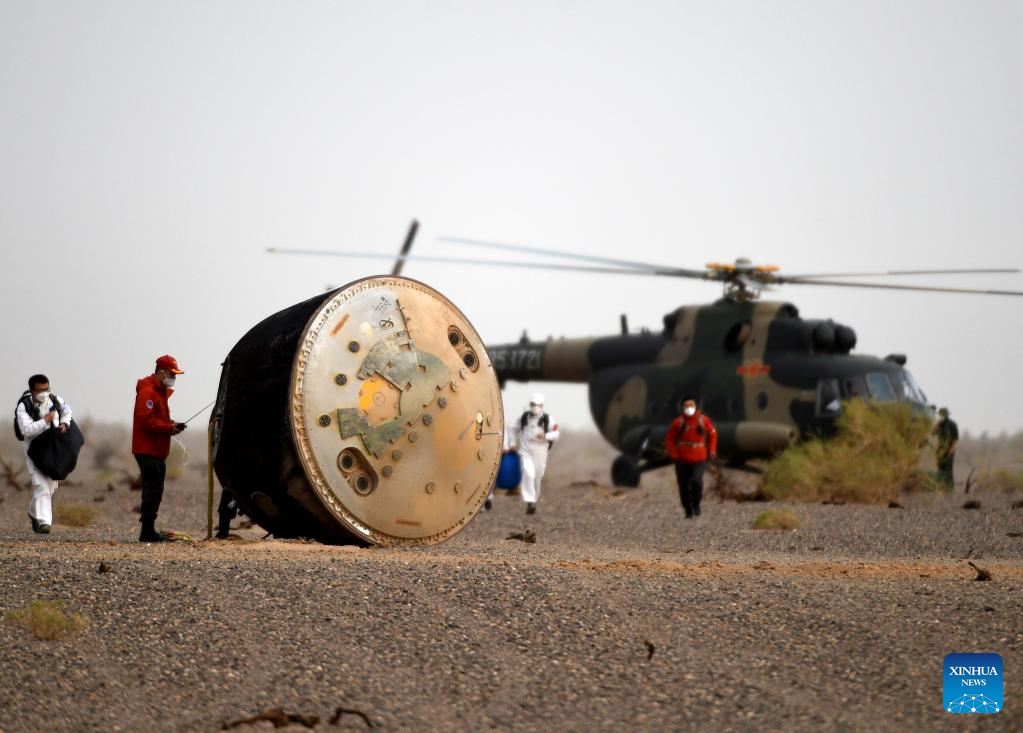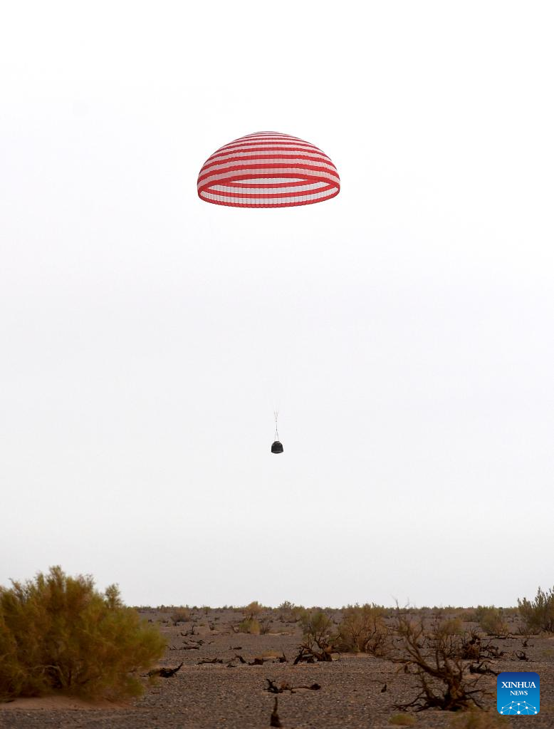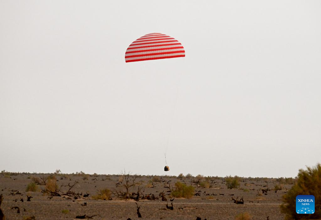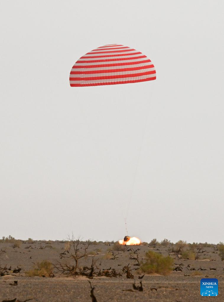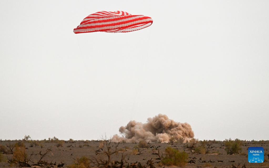 JIUQUAN, June 4 (Xinhua) -- The return capsule of the Shenzhou-15 manned spaceship, carrying astronauts Fei Junlong, Deng Qingming and Zhang Lu, touched down at the Dongfeng landing site in north China's Inner Mongolia Autonomous Region safely on Sunday.