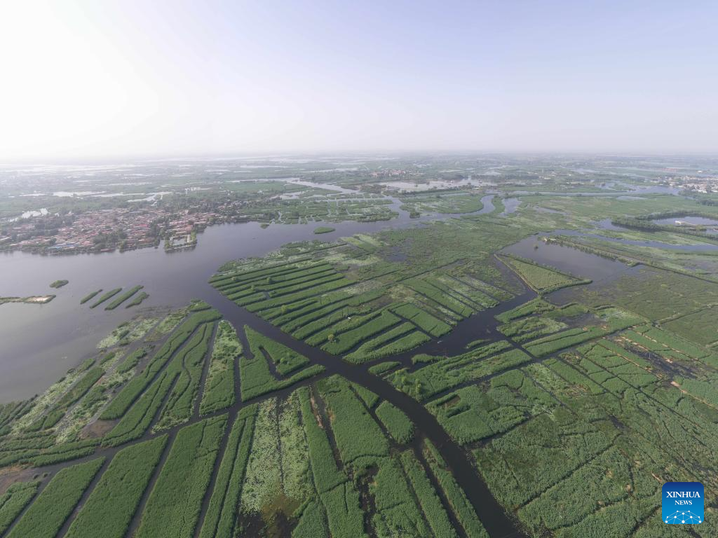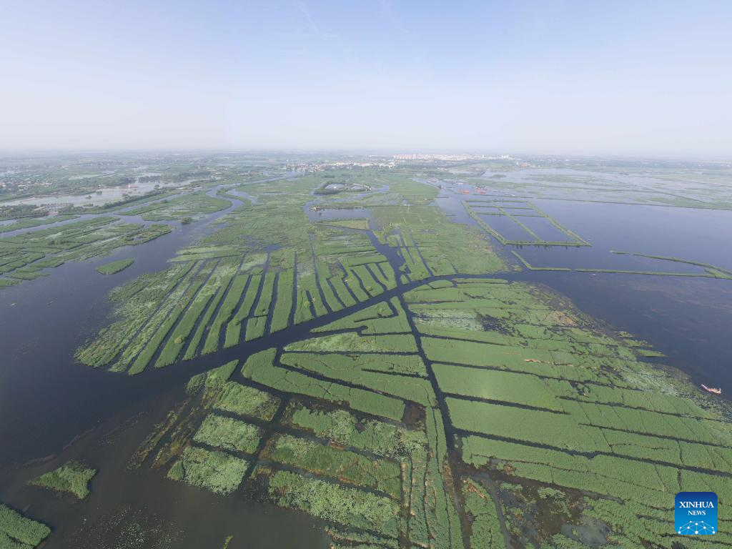 This aerial photo taken on June 1, 2023 shows the Baiyangdian scenic area in Xiong'an New Area, north China's Hebei Province. Located about 100 kilometers southwest of Beijing, the Xiong'an New Area has been designed as a major recipient of functions previously located in Beijing but which are not essential to its role as China's capital. Six years on, Xiong'an New Area, China's "city of the future", is offering a glimpse of the Chinese vision of modernity. (Xinhua/Zhu Xudong)