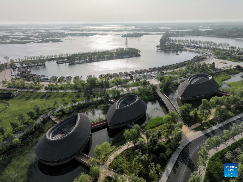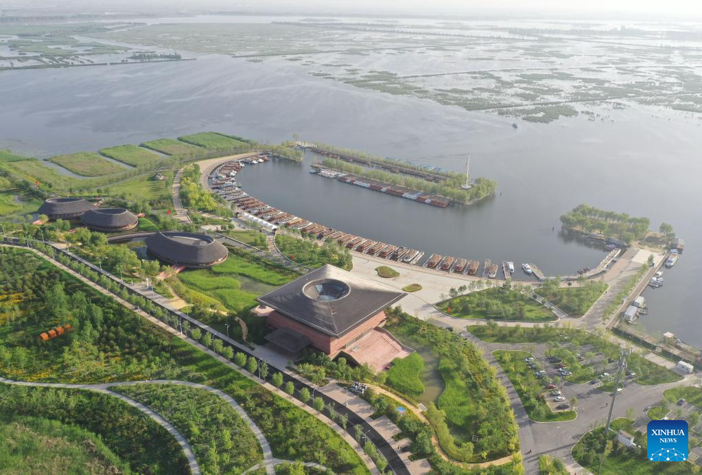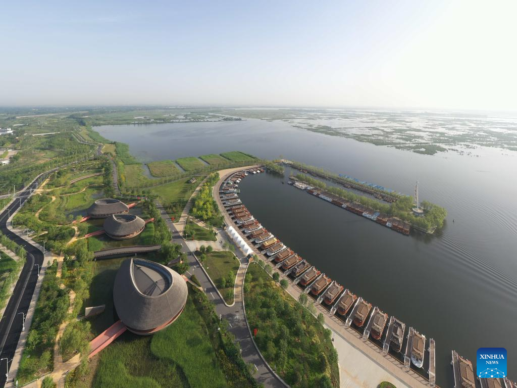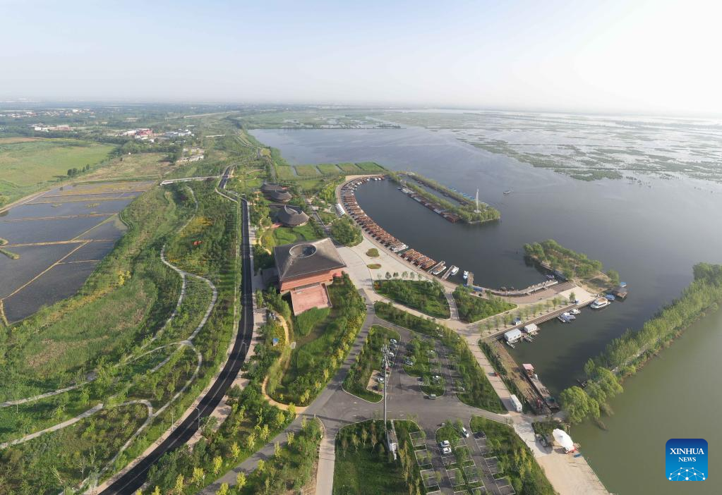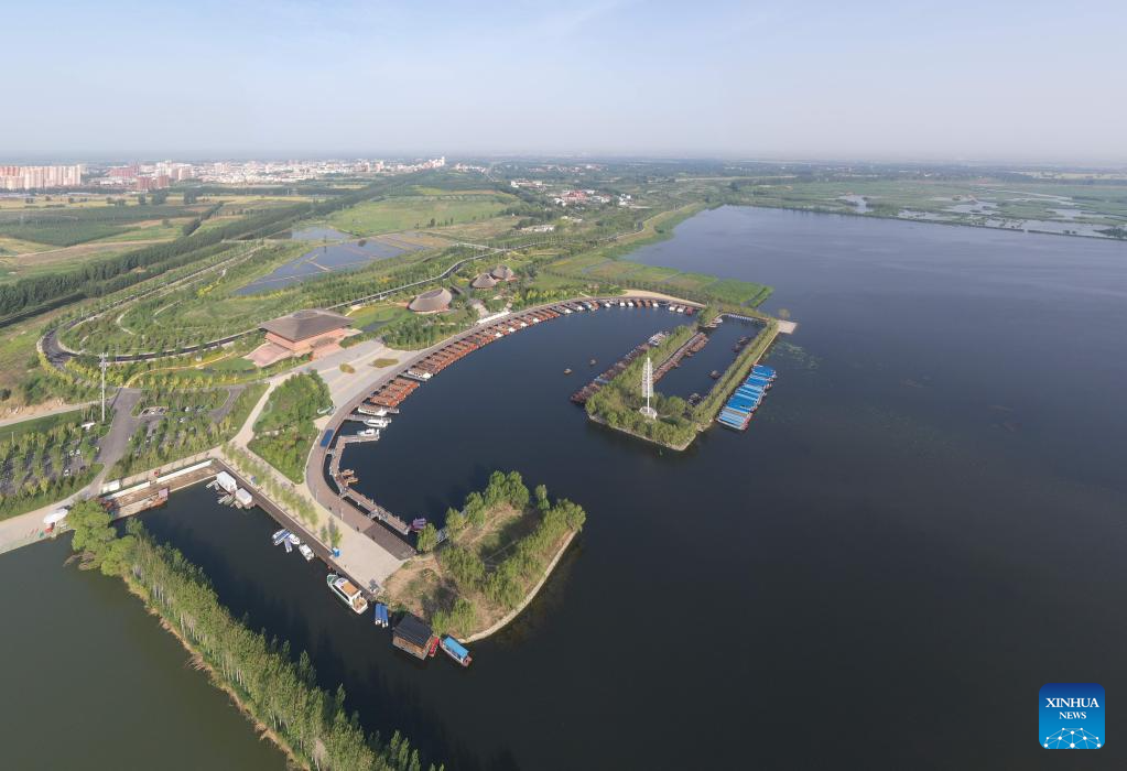 This aerial photo taken on June 1, 2023 shows the tourist dock of Baiyangdian Lake in Xiong'an New Area, north China's Hebei Province. Located about 100 kilometers southwest of Beijing, the Xiong'an New Area has been designed as a major recipient of functions previously located in Beijing but which are not essential to its role as China's capital. Six years on, Xiong'an New Area, China's "city of the future", is offering a glimpse of the Chinese vision of modernity. (Xinhua/Zhu Xudong)