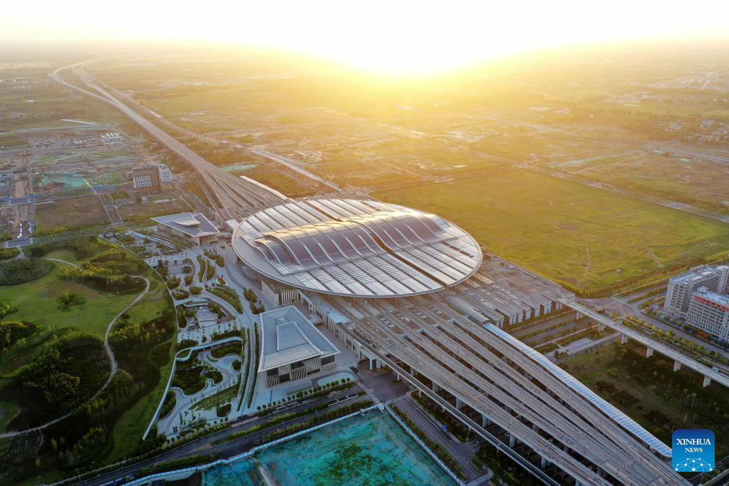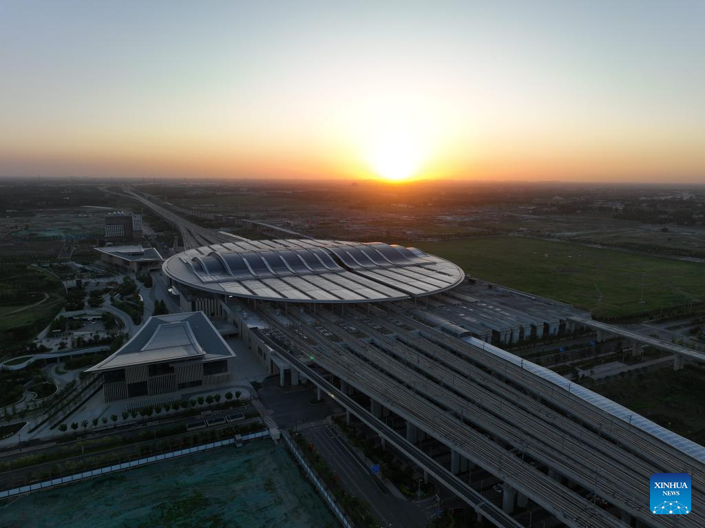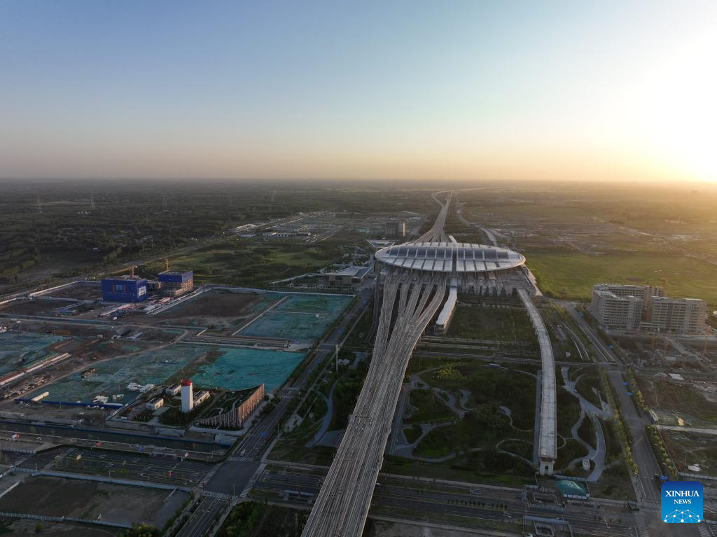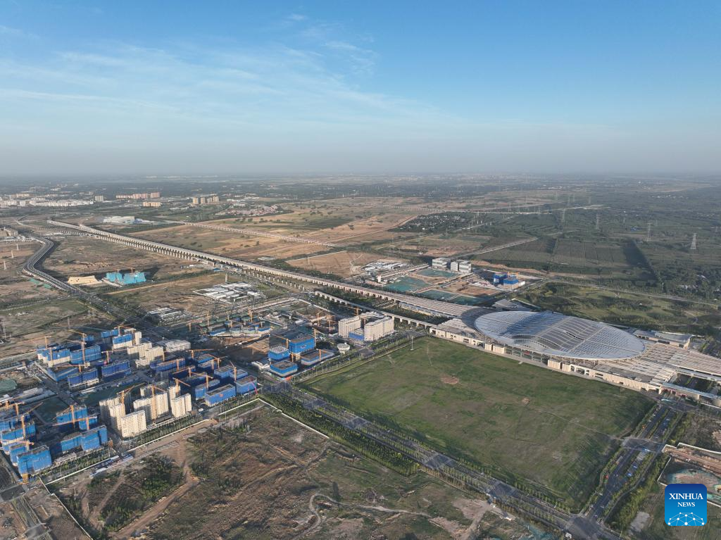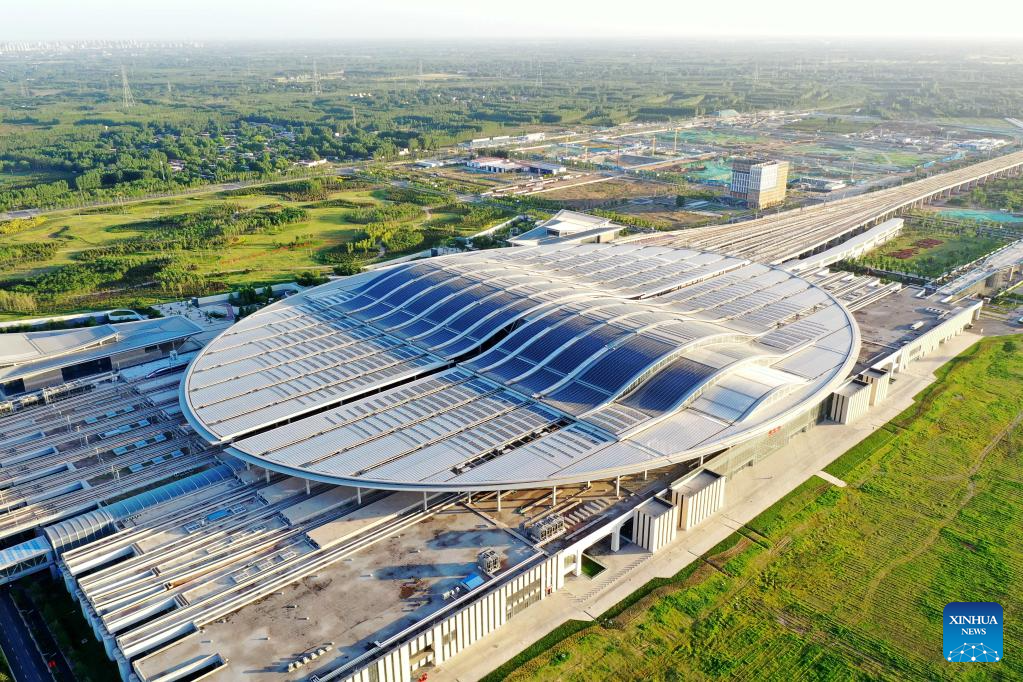 This aerial photo taken on June 2, 2023 shows the Xiong'an Railway Station in Xiong'an New Area, north China's Hebei Province. Located about 100 kilometers southwest of Beijing, the Xiong'an New Area has been designed as a major recipient of functions previously located in Beijing but which are not essential to its role as China's capital. Six years on, Xiong'an New Area, China's "city of the future", is offering a glimpse of the Chinese vision of modernity. (Xinhua/Zhu Xudong)