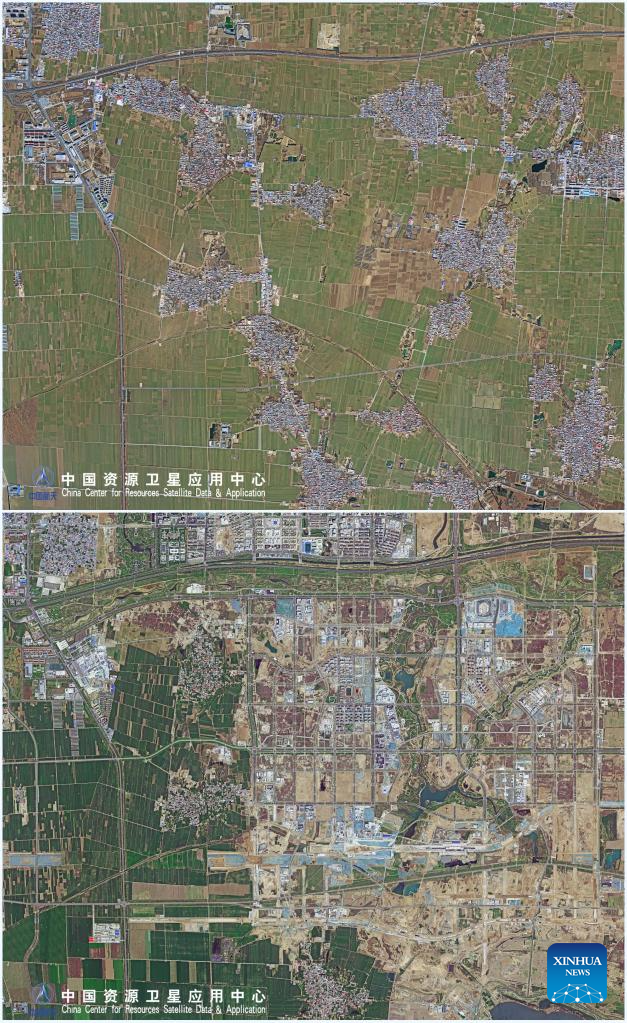 This combined satellite photo shows the start-up area in Xiong'an New Area, north China's Hebei Province on Feb. 23, 2017 (above) and May 10, 2023, respectively. Located about 100 kilometers southwest of Beijing, the Xiong'an New Area has been designed as a major recipient of functions previously located in Beijing but which are not essential to its role as China's capital. Six years on, Xiong'an New Area, China's "city of the future", is offering a glimpse of the Chinese vision of modernity. (China Center for Resources Satellite Data and Application/Handout via Xinhua)