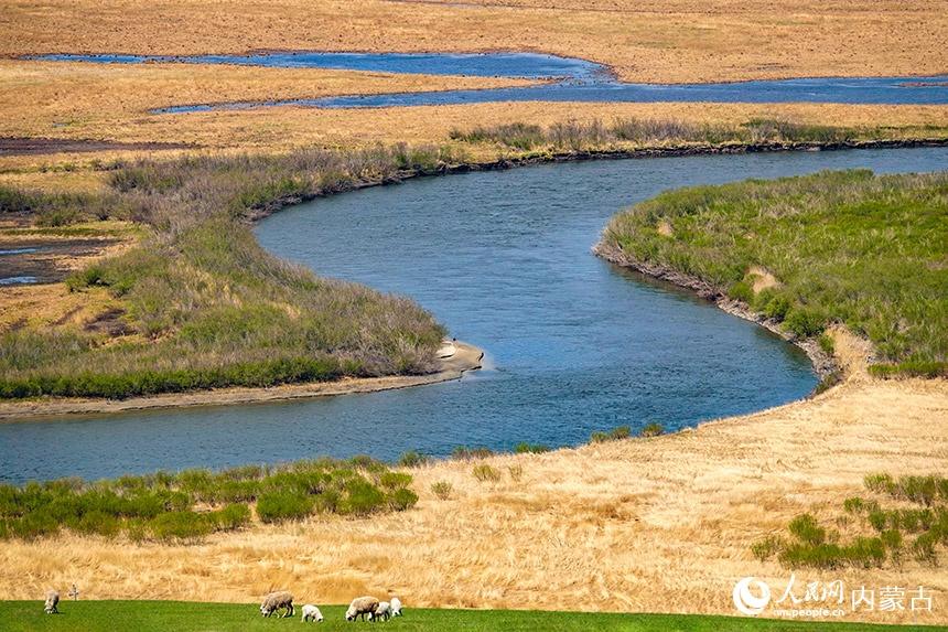 Sheep and cattle graze beside Ergun River in Hulun Buir city, north China's Inner Mongolia Autonomous Region. (Photo/Lyu Haojun)