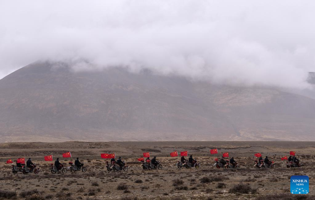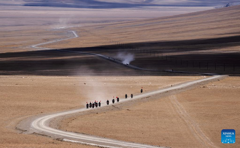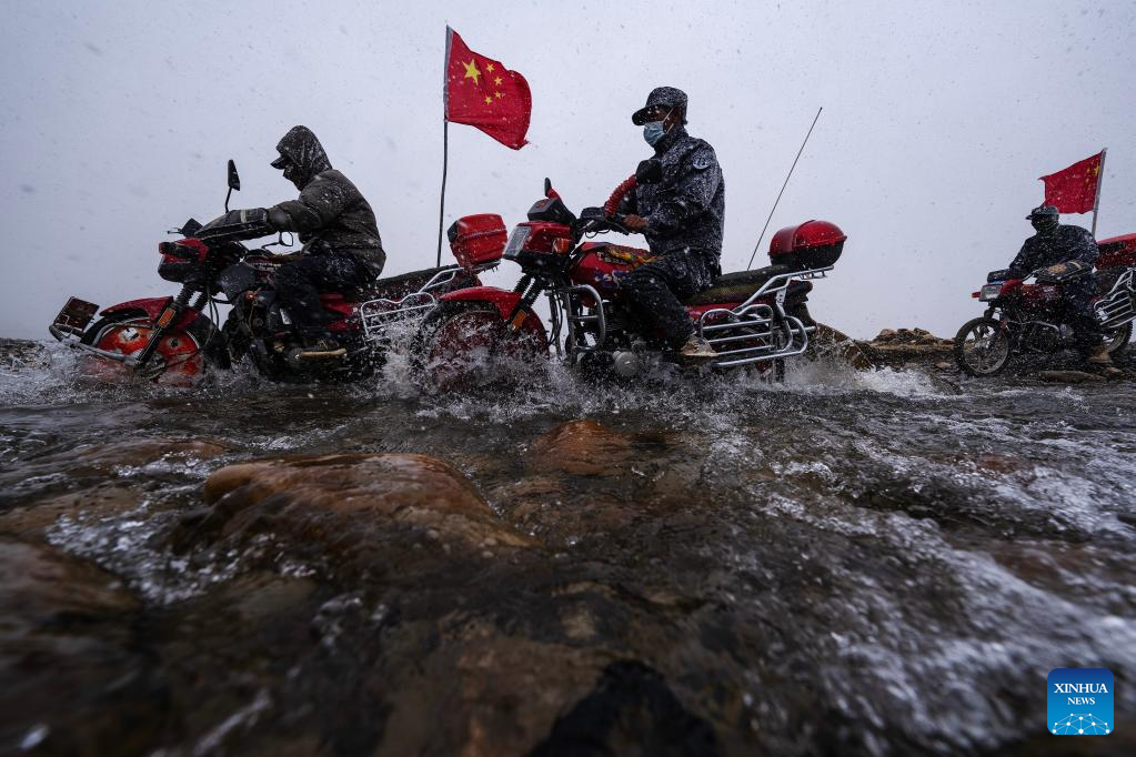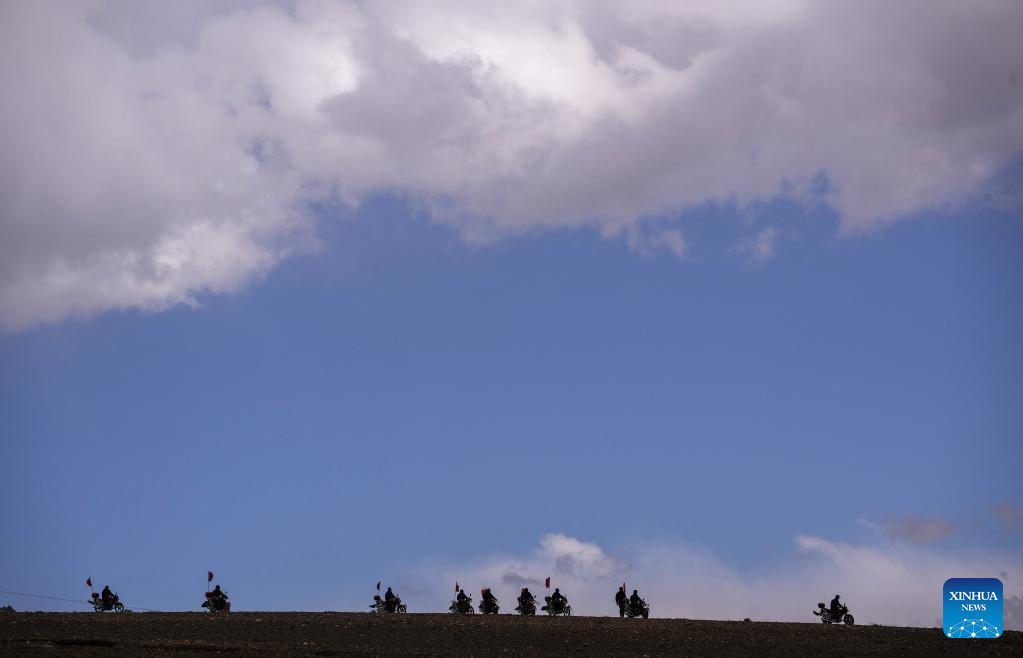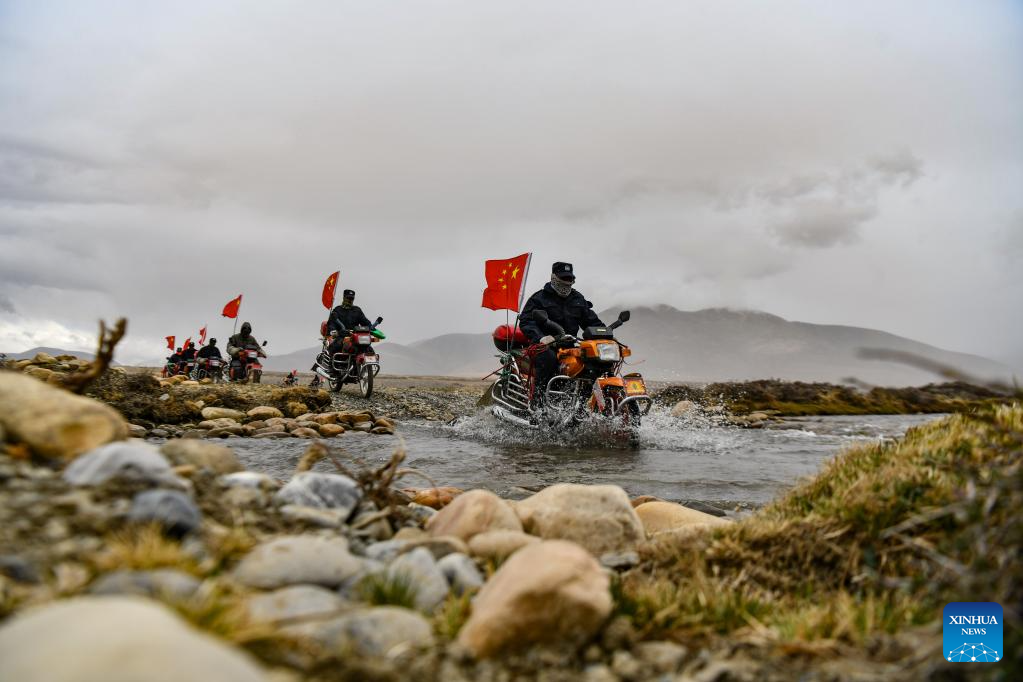 Members of the border defense team patrol on motorcycles in Changgo Township of Xigaze City, southwest China's Tibet Autonomous Region, June 2, 2023. Changgo Township, with an average elevation of over 5,000 meters, is a border township adjacent to Nepal with a 105-kilometer borderline. (Xinhua/Jigme Dorji)